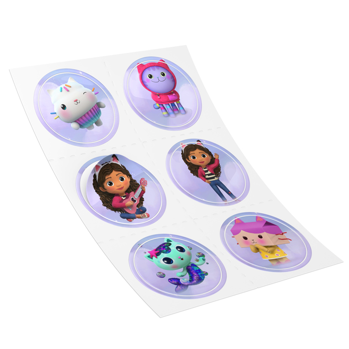 Στρογγυλά αυτοκόλλητα με θέμα Gabby’s Dollhouse για να διακοσμήσεις τα αντικείμενα του πάρτυ ή να δώσεις ως ενθύμιο στα παιδάκια του πάρτυ!