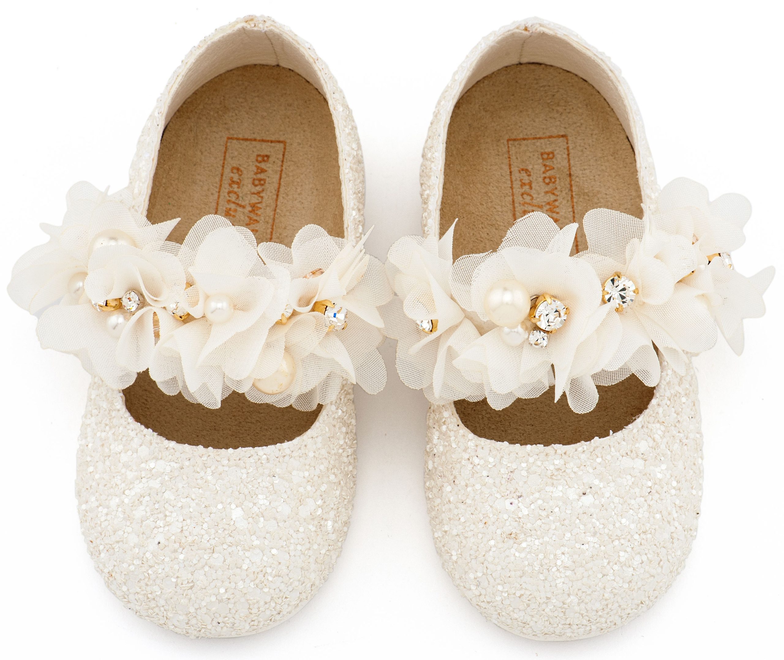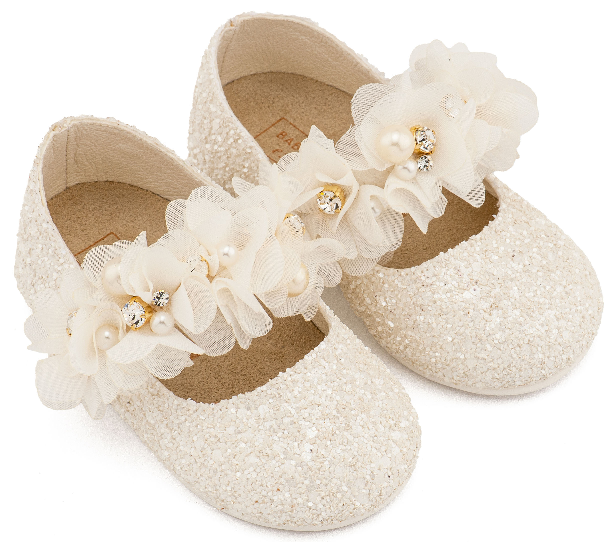 Υφασμάτινο Glitter Γοβάκι Μονή Μπαρέτα Στρας με Λουλούδια Πέρλες και Κρύσταλα Swarovski σε Εκρού Χρώμα.
