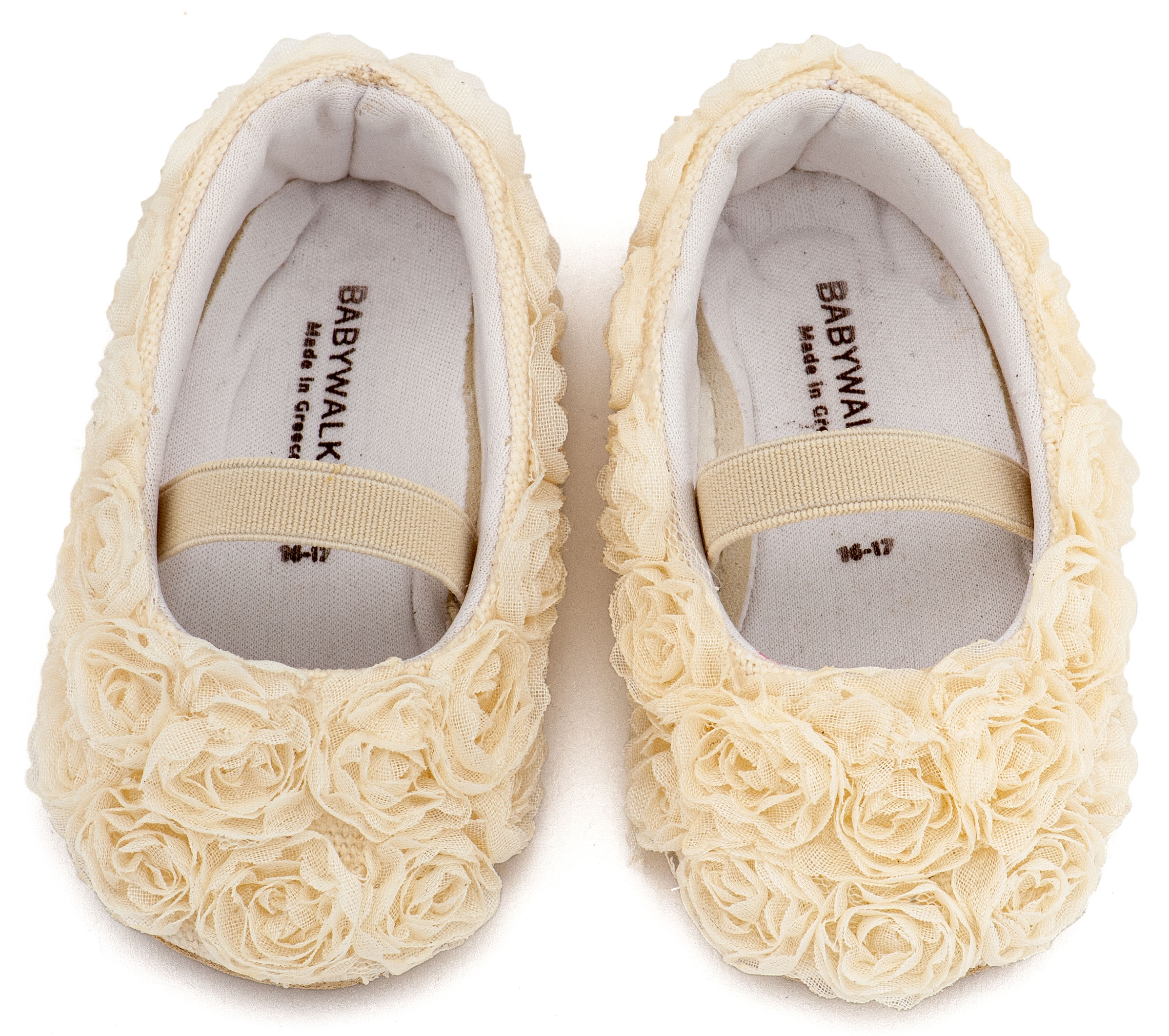 Βαπτιστικό παπούτσι Ελληνικής κατασκευής από την Babywalker, Υφασμάτινη Μπαλαρινα Διακοσμημένη με Chiffon Λουλούδια Εκρού Χρώμα.