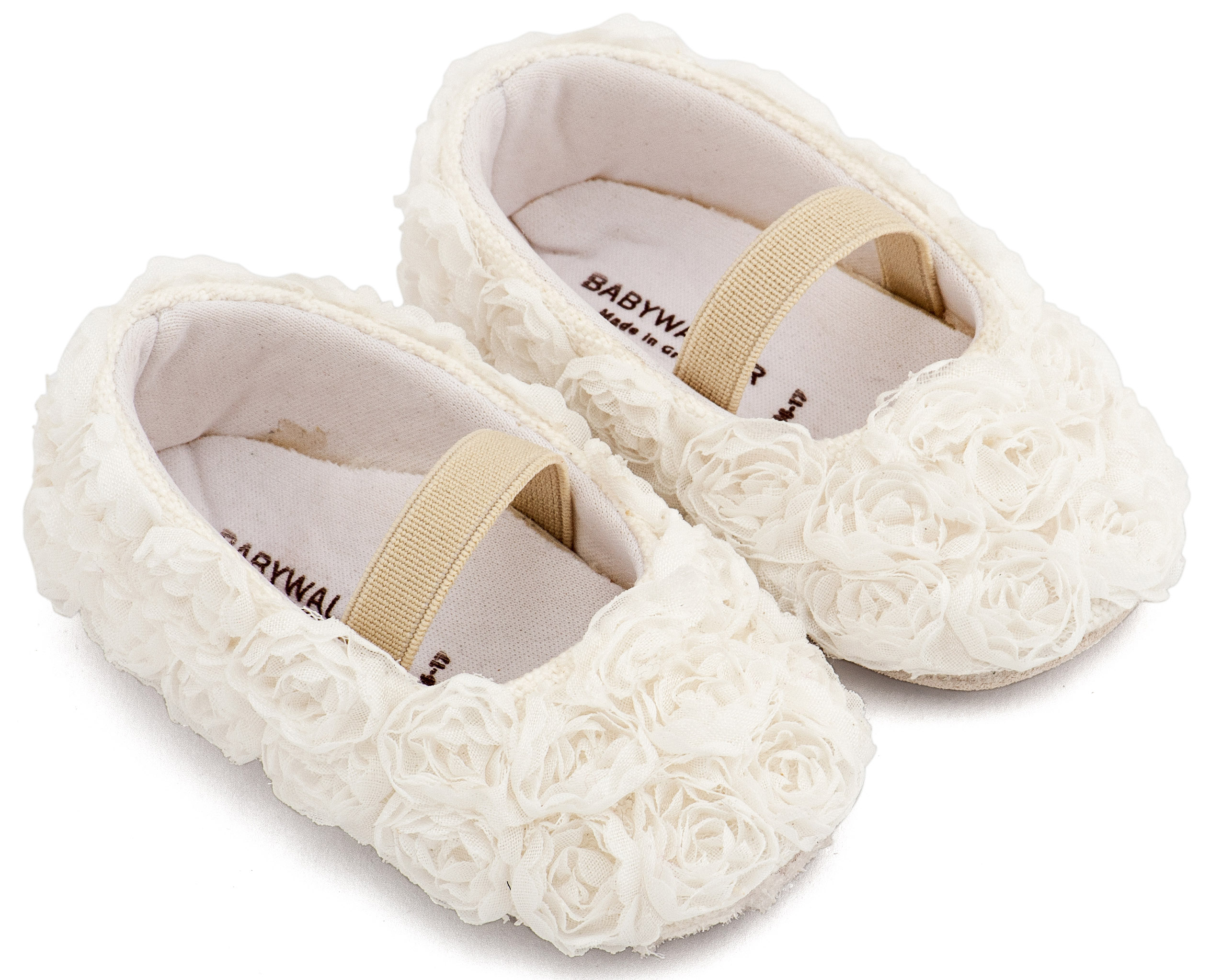 Βαπτιστικό παπούτσι Ελληνικής κατασκευής από την Babywalker, Υφασμάτινη Μπαλαρινα Διακοσμημένη με Chiffon Λουλούδια Λευκό Χρώμα.