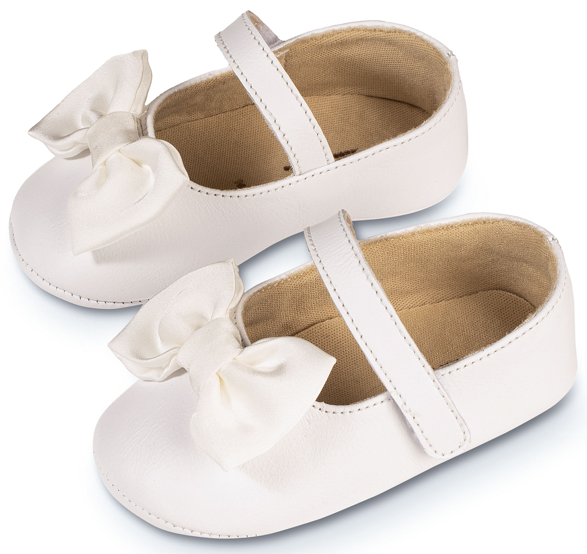 Βαπτιστικό παπούτσι Ελληνικής κατασκευής από την Babywalker, Δερμάτινο Γοβάκι Μονή Μπαρέτα με Υφασμάτινο Χειροποίητο Φιογκάκι σε Λευκό Χρώμα.