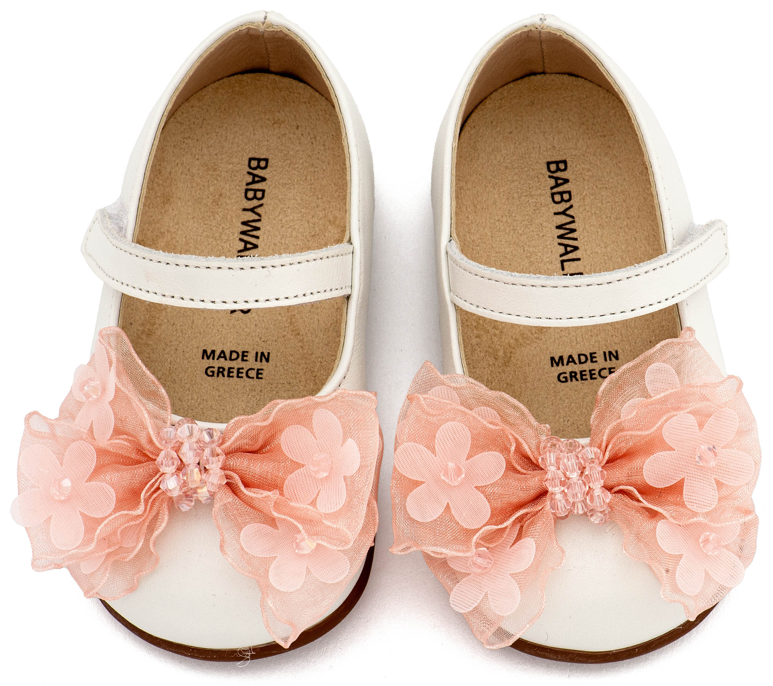 Βαπτιστικό παπούτσι Ελληνικής κατασκευής από την Babywalker, Δερμάτινο Γοβάκι Μονή Μπαρέτα Φιογκάκι Οργάντζας σε Εκρού Ροζ Χρώμα.