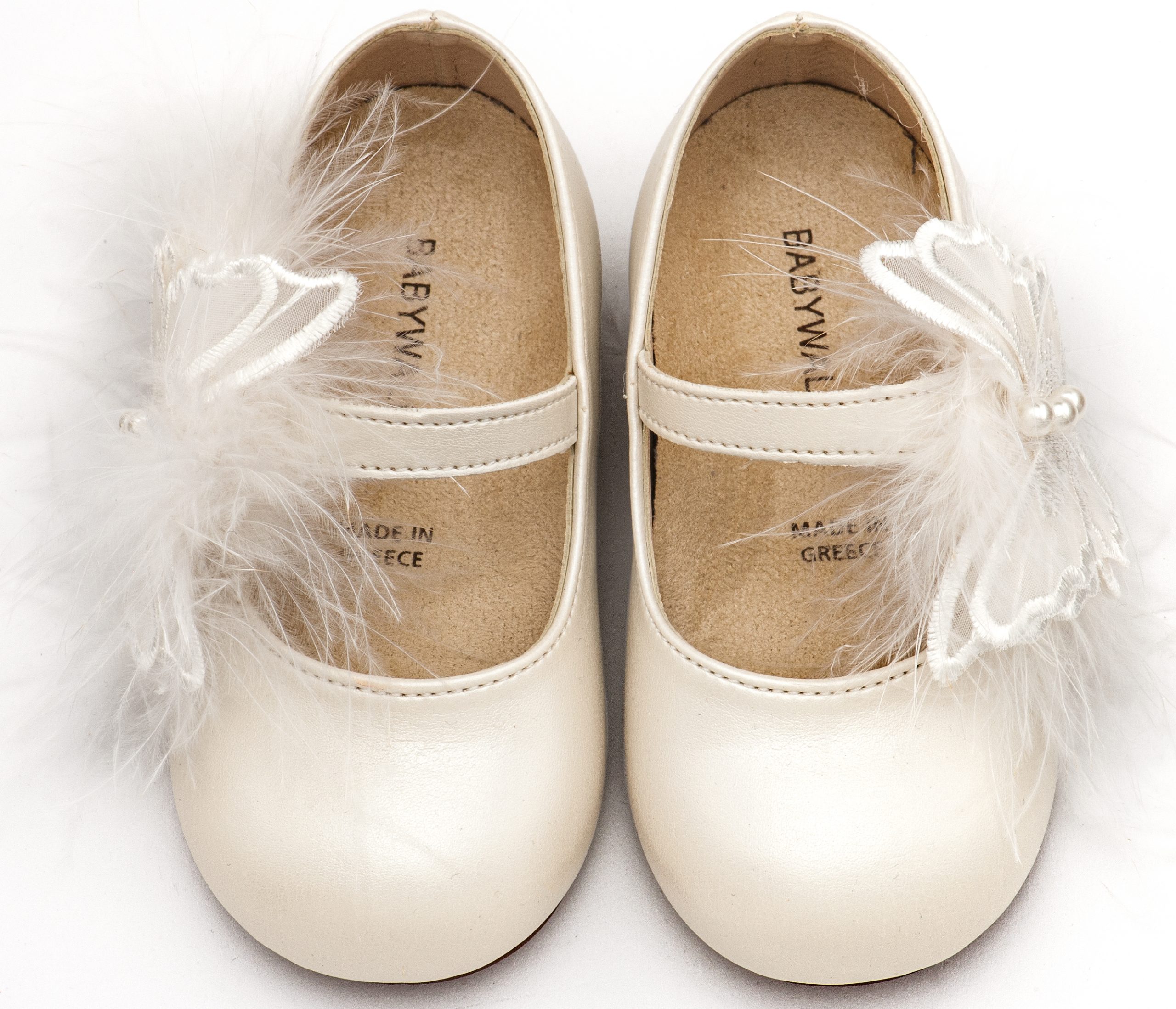 Βαπτιστικό παπούτσι Ελληνικής κατασκευής από την Babywalker, Δερμάτινο Γοβάκι Μονή Μπαρέτα με Χειροποίητο Διακοσμητικό Πεταλούδα και Πούπουλα σε Εκρού Χρώμα.
