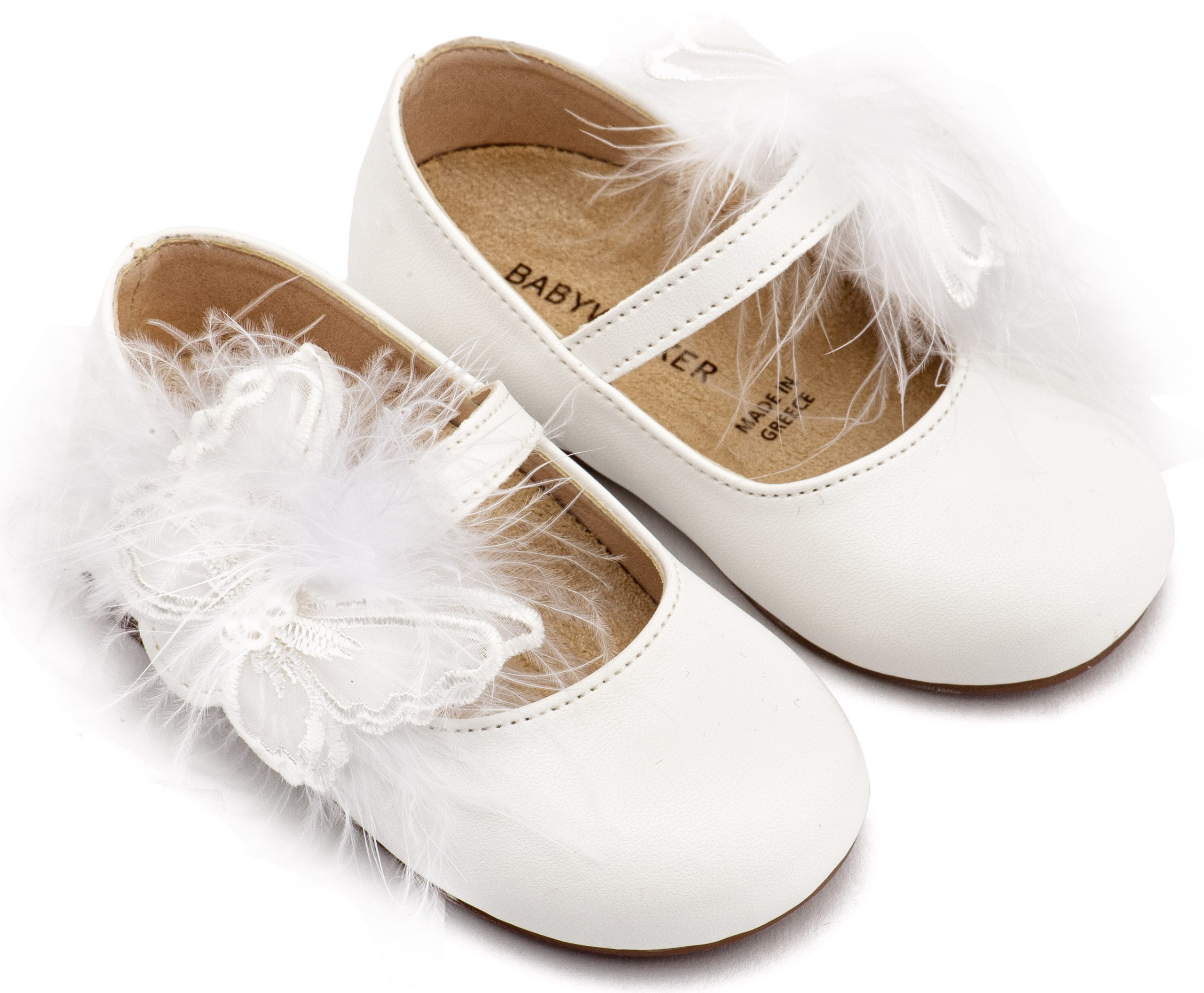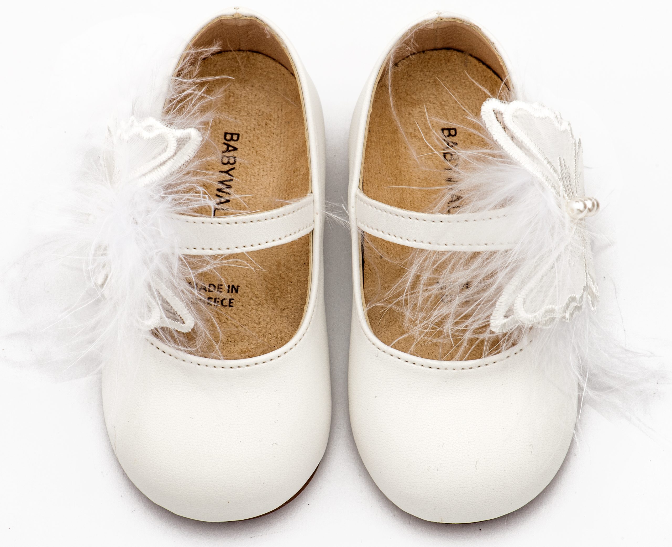 Βαπτιστικό παπούτσι Ελληνικής κατασκευής από την Babywalker, Δερμάτινο Γοβάκι Μονή Μπαρέτα με Χειροποίητο Διακοσμητικό Πεταλούδα και Πούπουλα σε Λευκό Χρώμα.