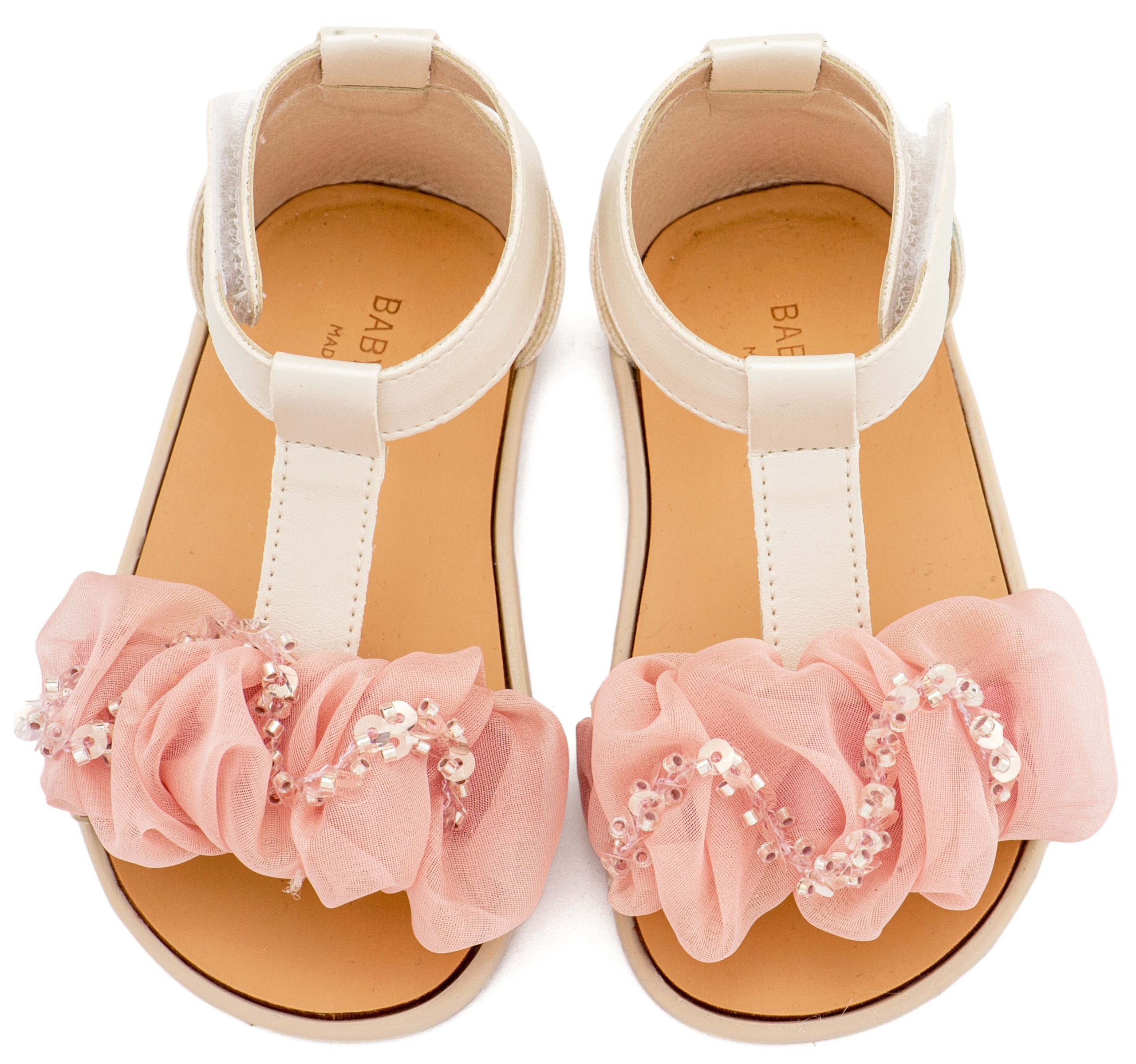 Βαπτιστικό παπούτσι Ελληνικής κατασκευής από την Babywalker, Δερμάτινο Πέδιλο Διακοσμημένο με Χειροποίητο Διακοσμητικό Οργάντζας και Παγιέτες σε Εκρού Ροζ Χρώμα.