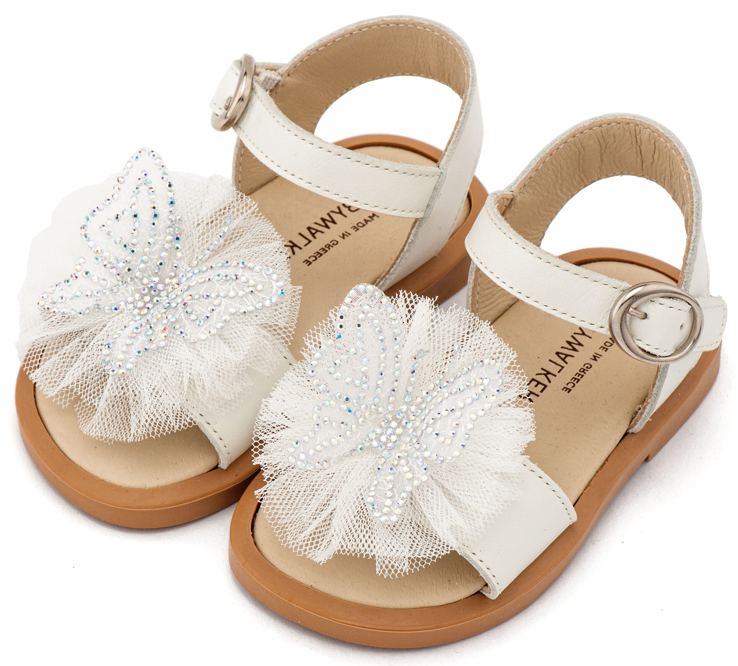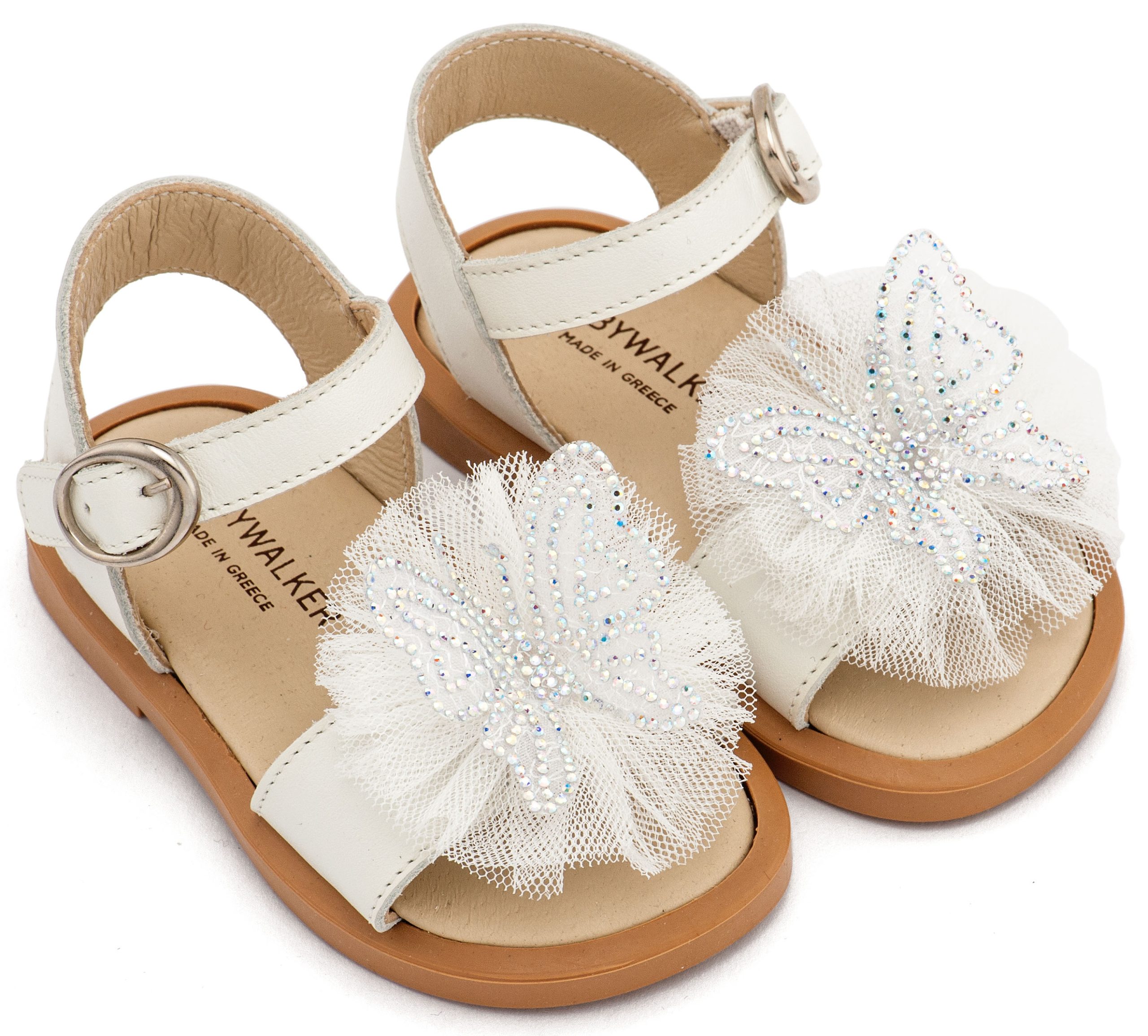 Βαπτιστικό παπούτσι Ελληνικής κατασκευής από την Babywalker, Δερμάτινο Πέδιλο Διακοσμημένο με Χειροποίητη Πεταλούδα και Τούλι σε Εκρού Χρώμα.
