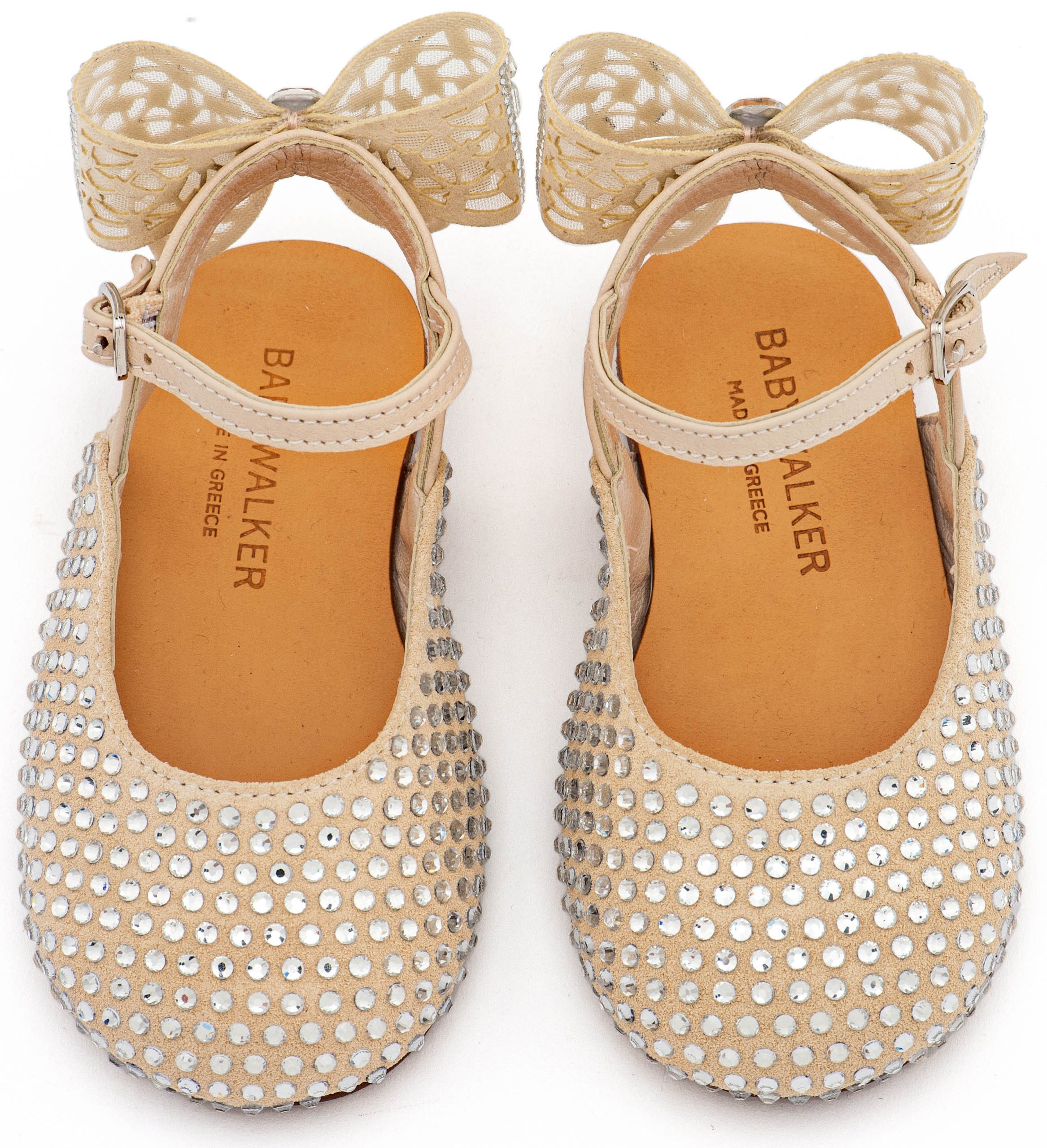 Δερμάτινο Σαμπό Διακοσμημένο Ολόγυρα με Στρας και Φιόγκο από Στρας στη Φτέρνα σε Μπεζ Χρώμα.