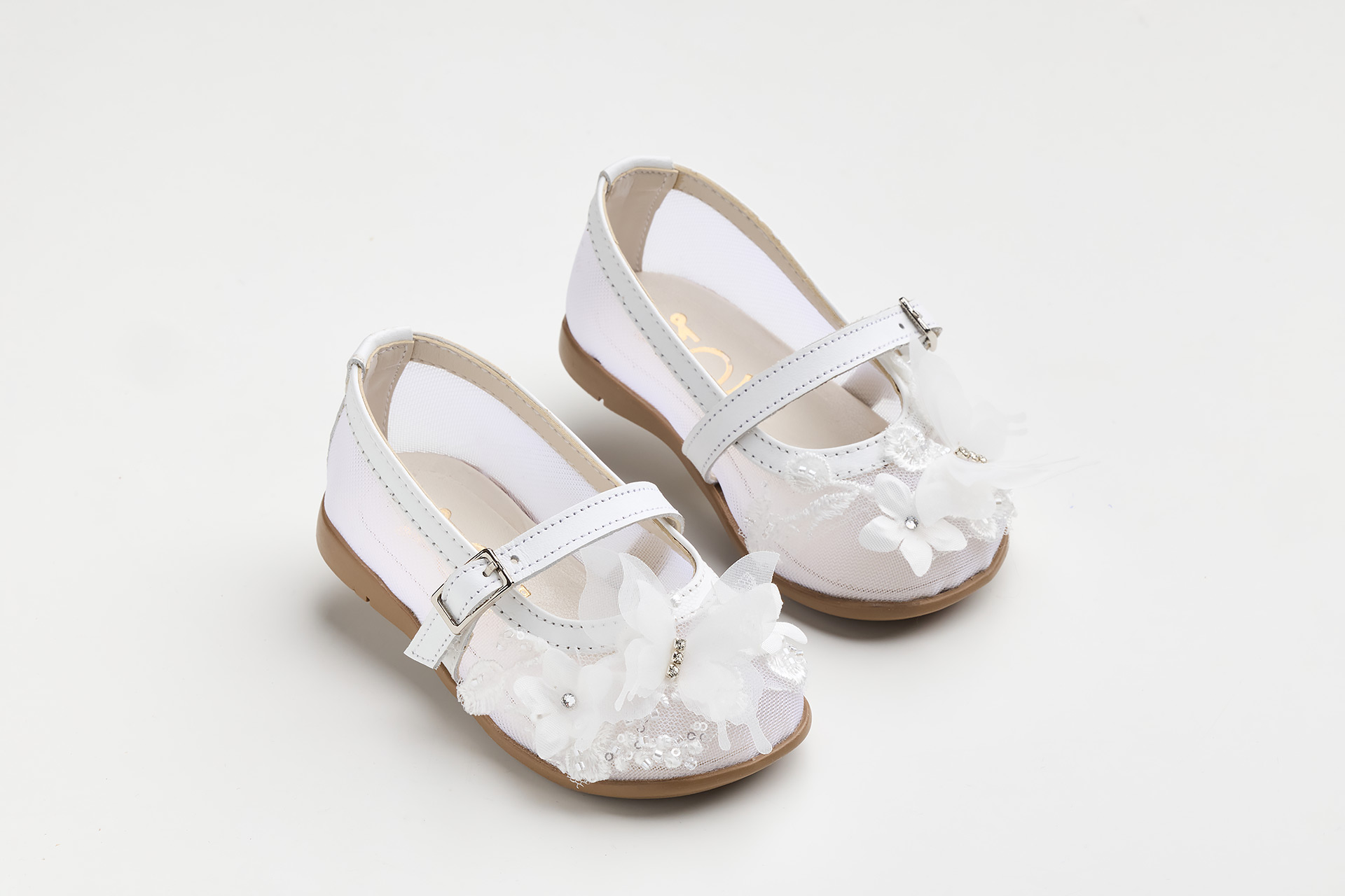 Pair of white dress sandals for a child with flower embellishments and tan soles photographed on a light background