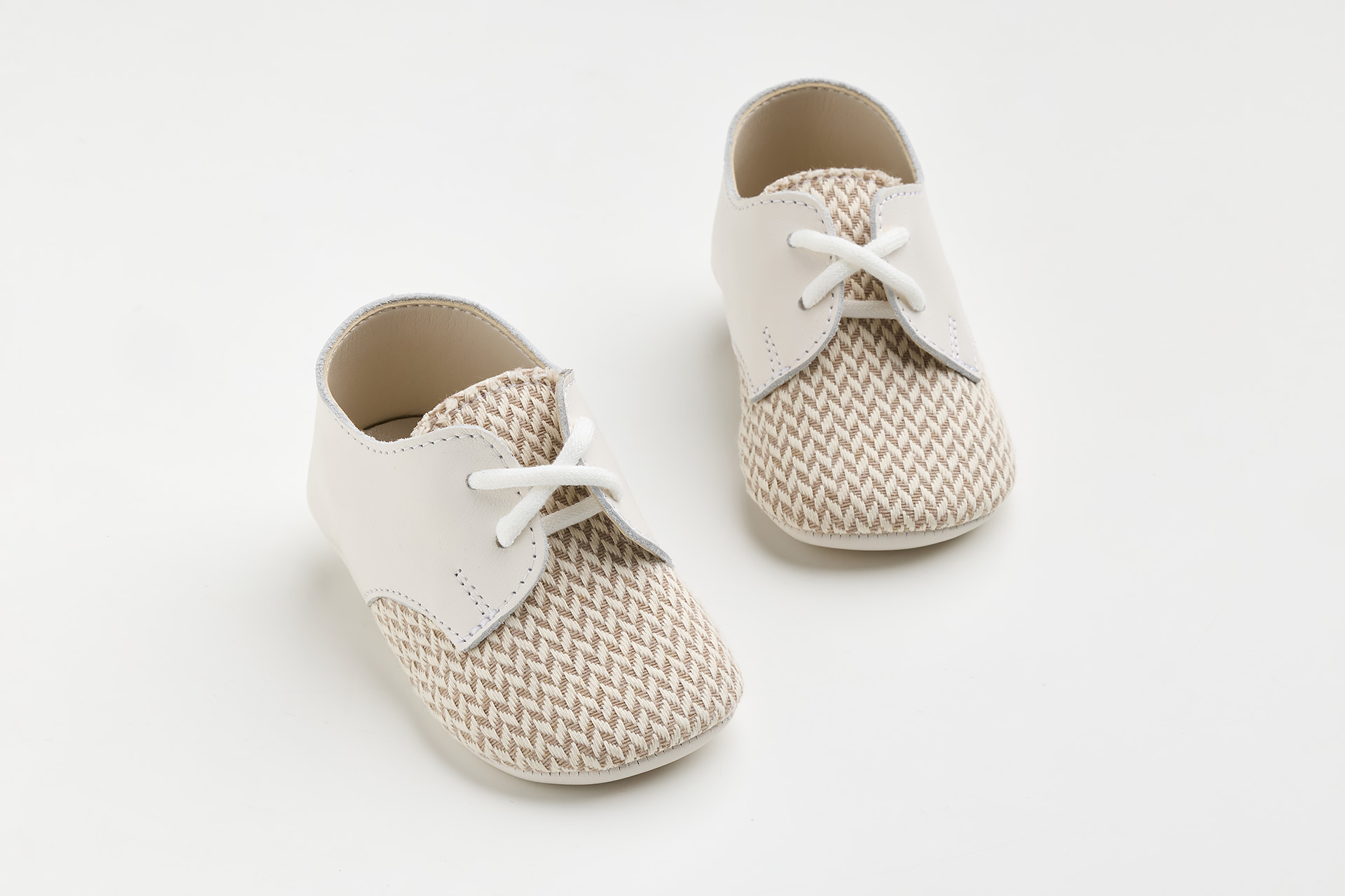 Παπουτσάκι αγκαλιάς σε εκρού λείο δέρμα και ύφασμα με μοτίβο, νούμερα 16-19.