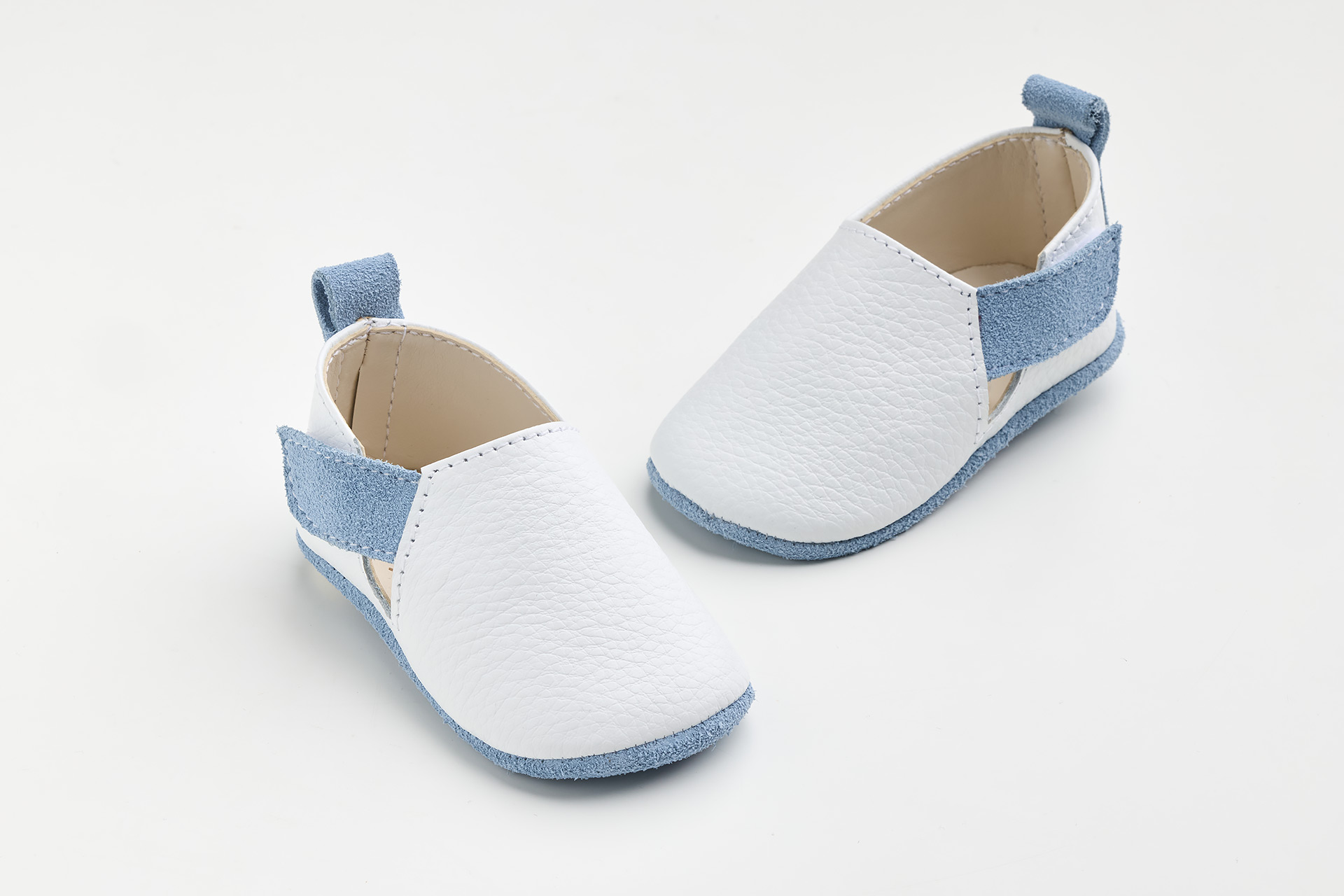 Παπουτσάκι αγκαλιάς σε λευκό δέρμα και γαλάζιο καστόρ, κλείσιμο με Velcro, νούμερα 16-19.