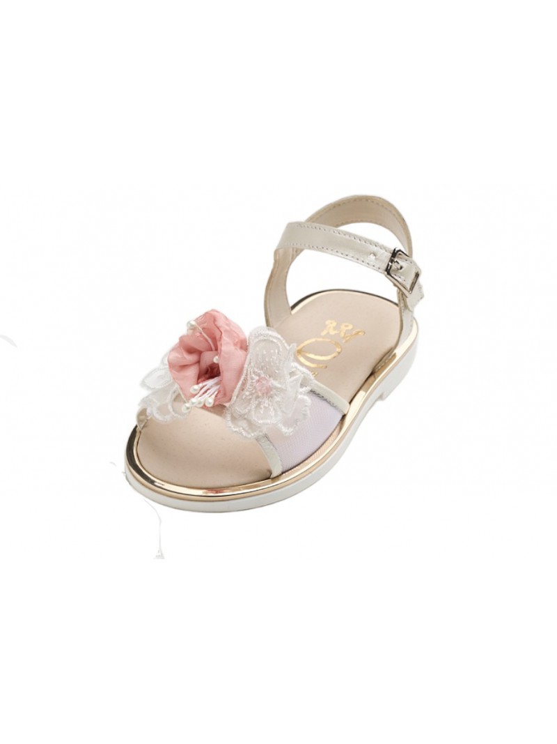 Βαπτιστικό Σανδάλι περπατήματος σε εκρού δέρμα και διαφάνεια με χειροποίητα λουλούδια σε off white και σάπιο μήλο, Ελληνικής Κατασκευής από την Everkids.