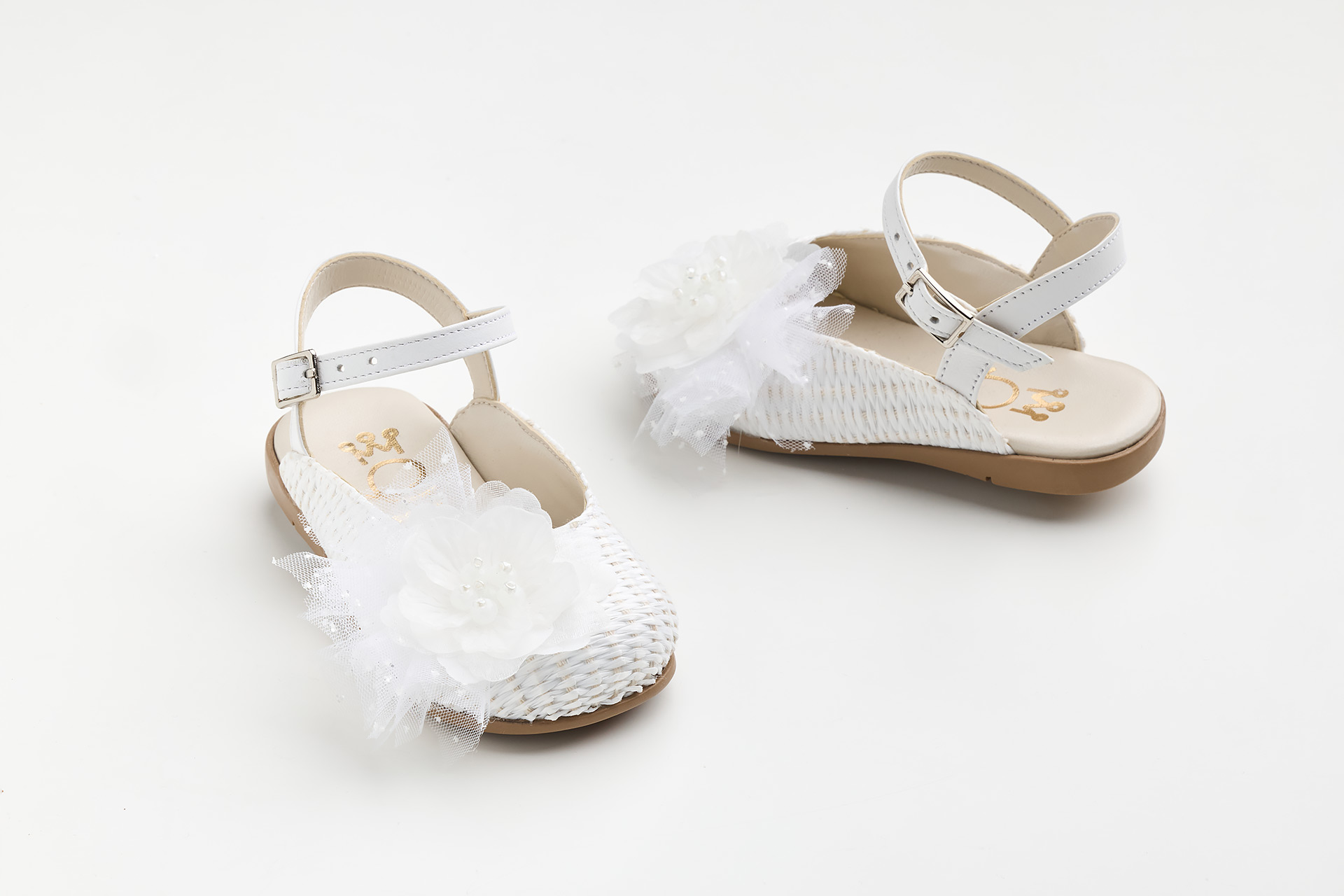 Μπαλαρίνα περπατήματος mule σε λευκή ψάθα και λευκό δέρμα με χειροποίητο διακοσμητικό με λουλούδι και πουα τούλι, Ελληνικής Κατασκευής από την Everkids.