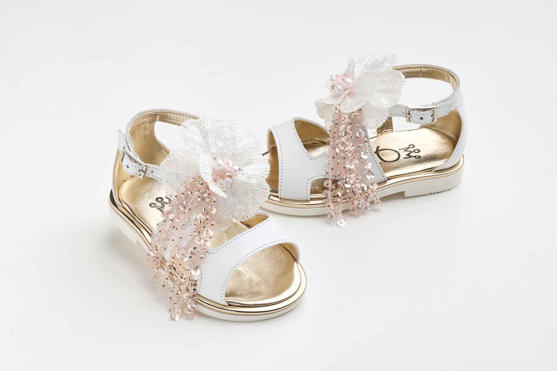 Βαπτιστικό σανδάλι περπατήματος σε λευκό δέρμα με χειροποίητο διακοσμητικό από λουλούδι κεντητό με παγιέτες και κρόσσια με ροζ παγιέτες και χάντρες, Ελληνικής Κατασκευής από την Everkids.