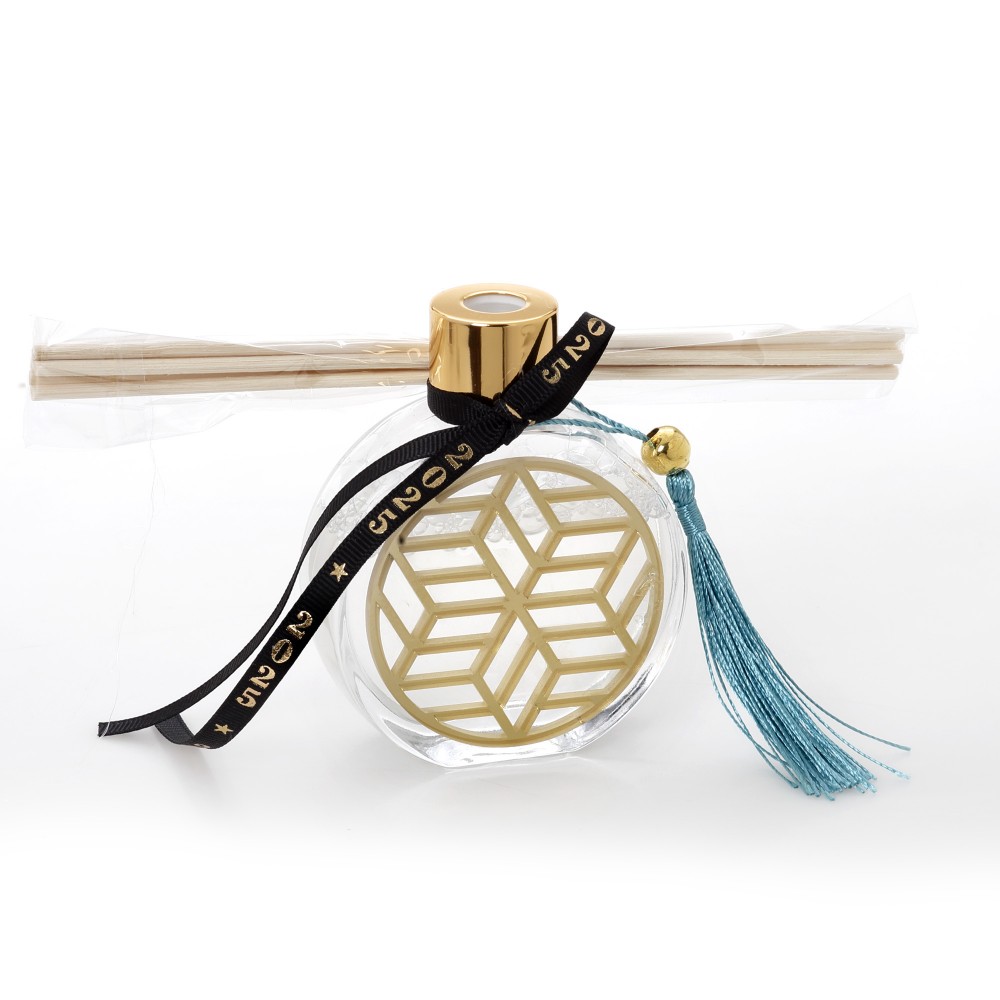 Αρωματικό χώρου με στικς, χρυσό μοτίβο και στολισμό μαύρη κορδέλα και τυρκουάζ φουντίτσα.