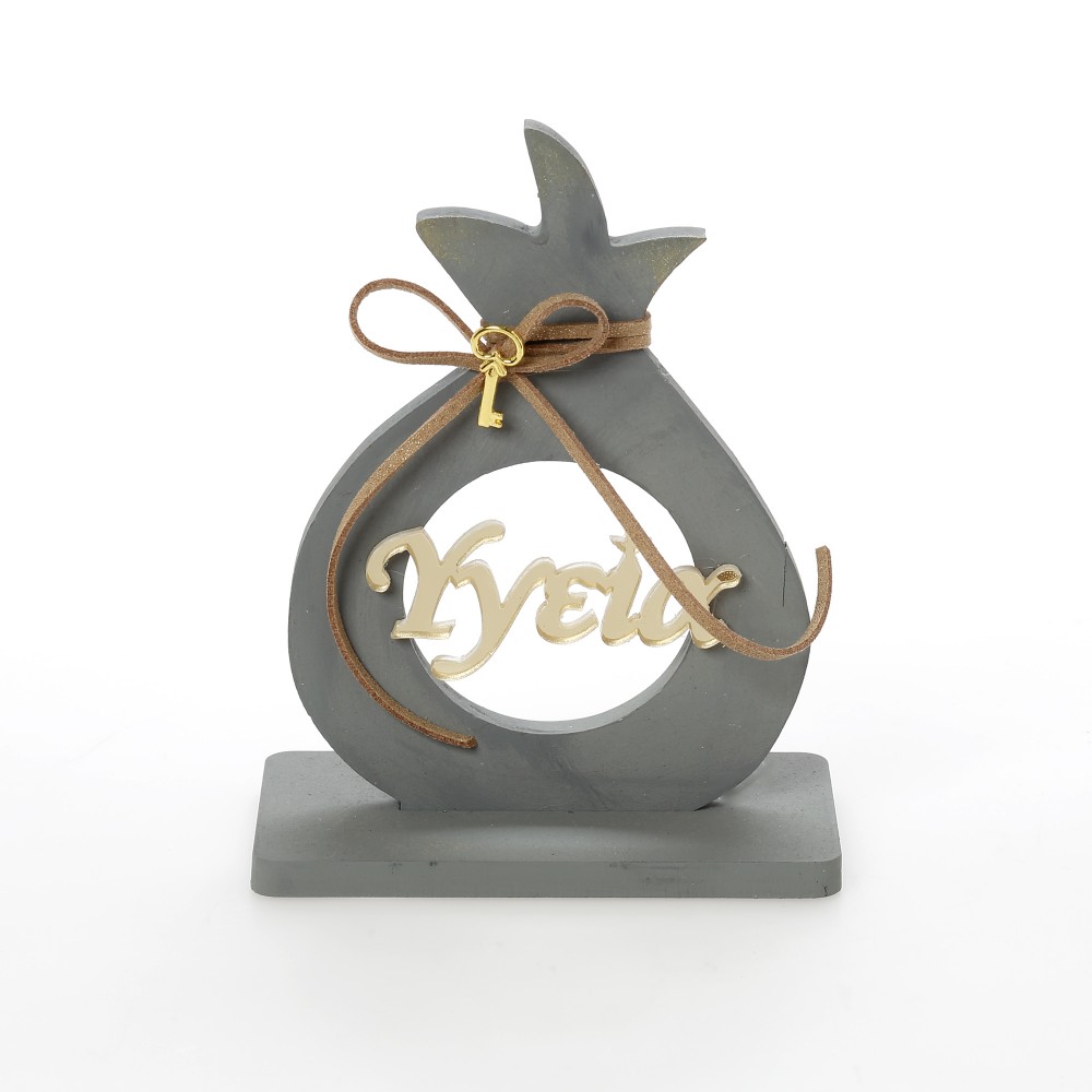 Ξύλινο γούρι ρόδι με βάση, σε γκρι χρώμα με χρυσά plexiglass γράμματα (Υγεία)