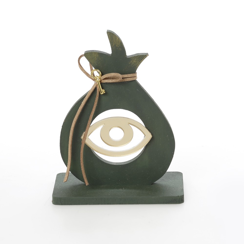 Ξύλινο γούρι ρόδι με βάση, σε πράσινο χρώμα και χρυσό plexiglass μάτι