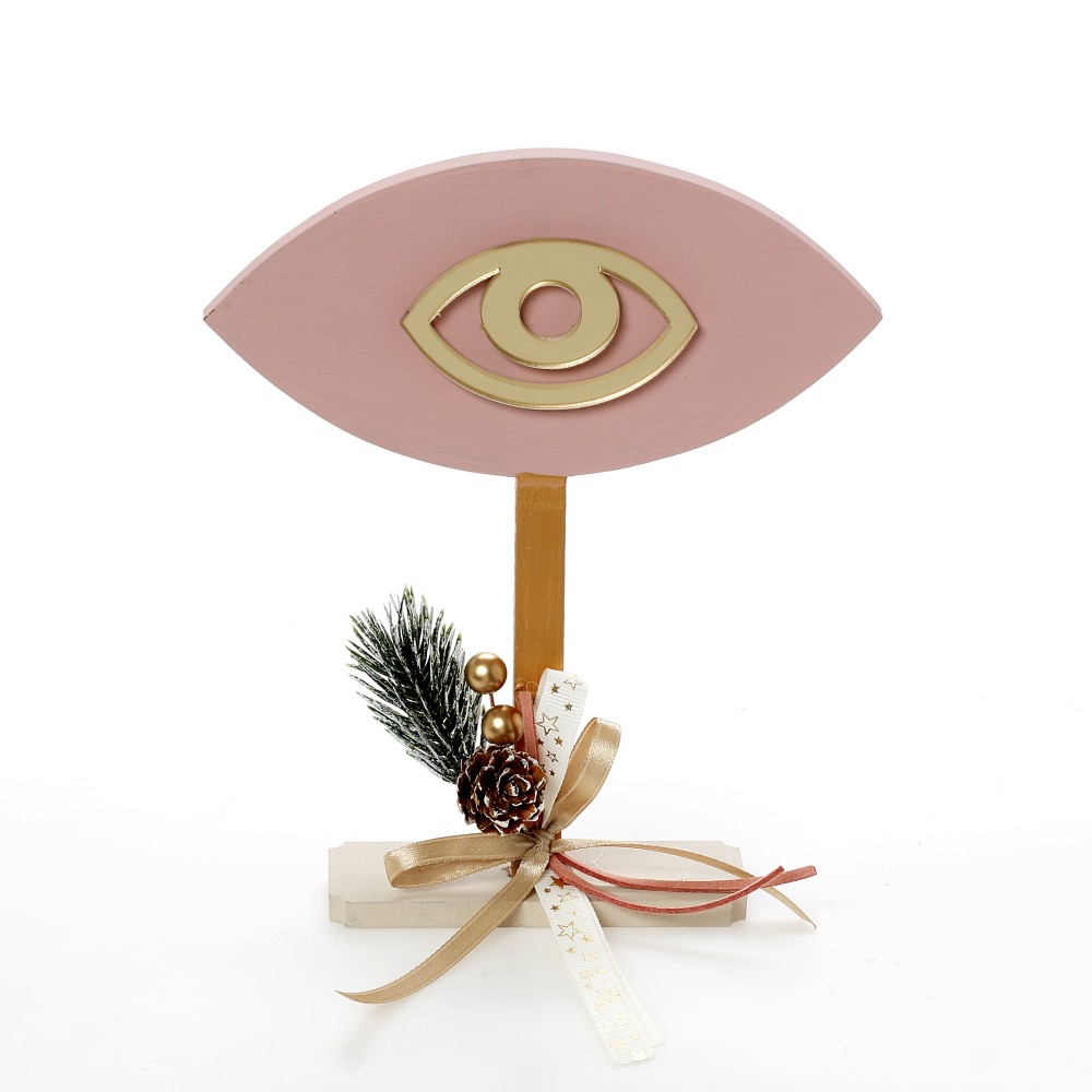 Ξύλινο γούρι μάτι με βάση, σε ροζ χρώμα και χρυσό plexiglass μάτι