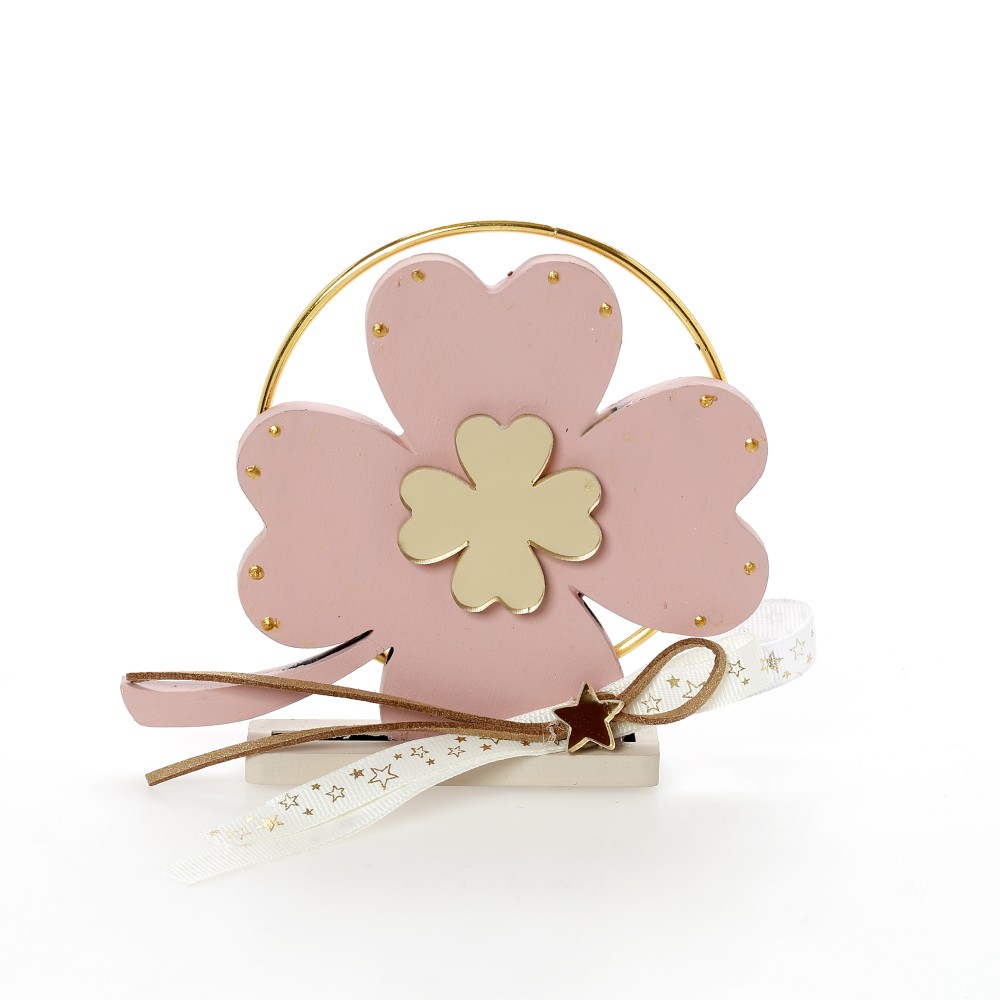 Ξύλινo γούρι τριφύλλι με βάση, σε ροζ χρώμα με χρυσό plexiglass τριφύλλι και χρυσό κρίκο