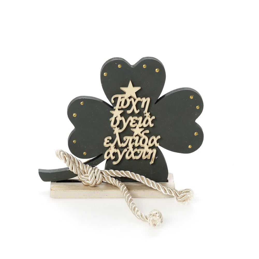 Ξύλινο γούρι τριφύλλι με βάση, σε λαδί χρώμα και χρυσά plexiglass γράμματα (Τύχη-Υγεία-Ελπίδα-Αγάπη)
