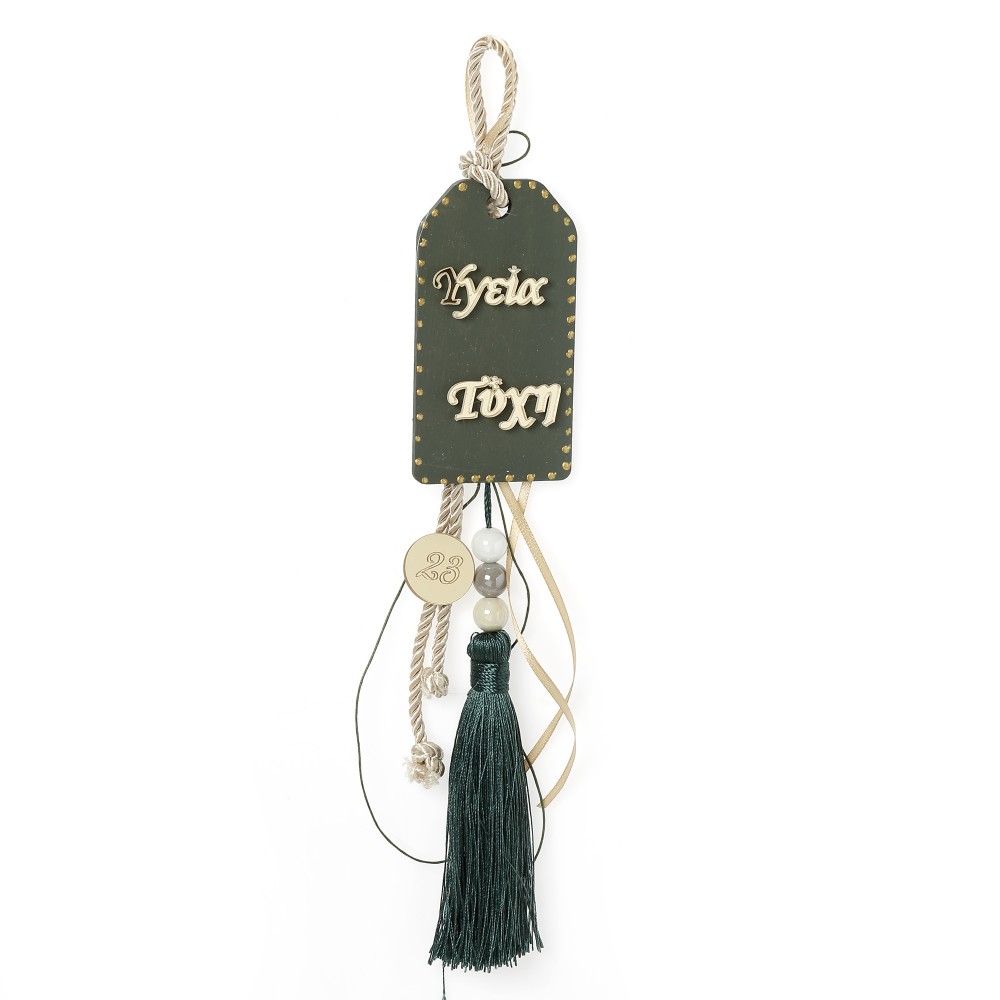 Ξύλινο κρεμαστό γούρι σε πράσινο χρώμα, με χρυσά plexiglass γράμματα (Υγεία – Τύχη)
