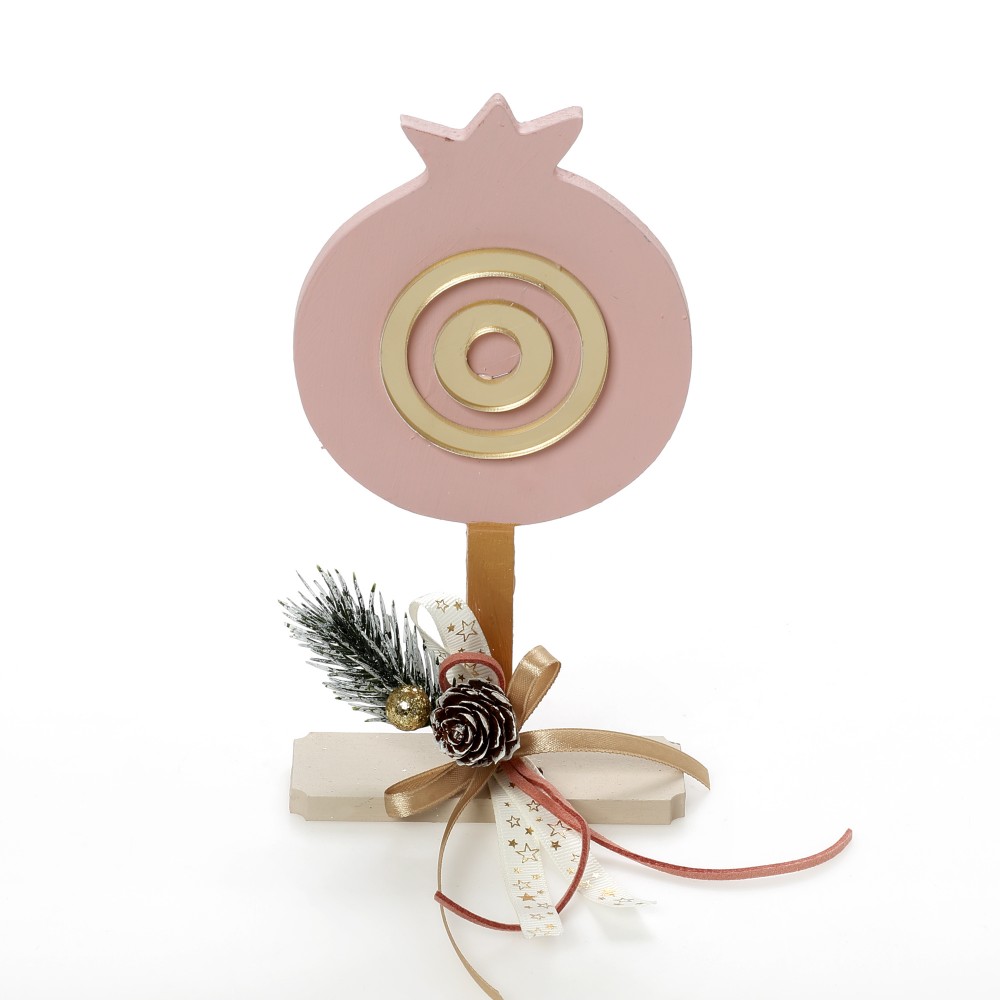 Ξύλινο γούρι ρόδι με βάση, σε ροζ χρώμα και χρυσό plexiglass μάτι