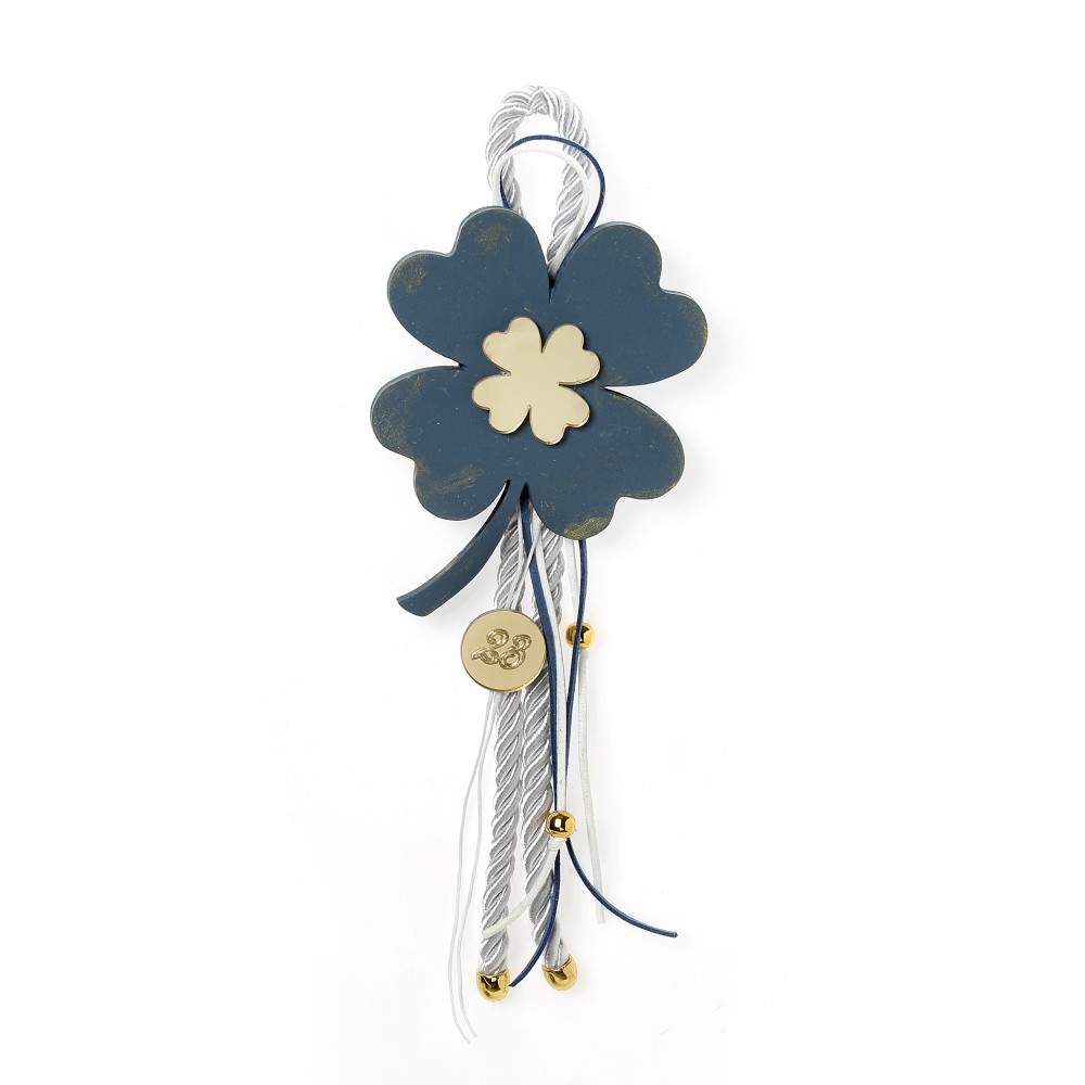 Ξύλινο κρεμαστό γούρι τριφύλλι, σε μπλε χρώμα και χρυσό plexiglass τριφύλλι