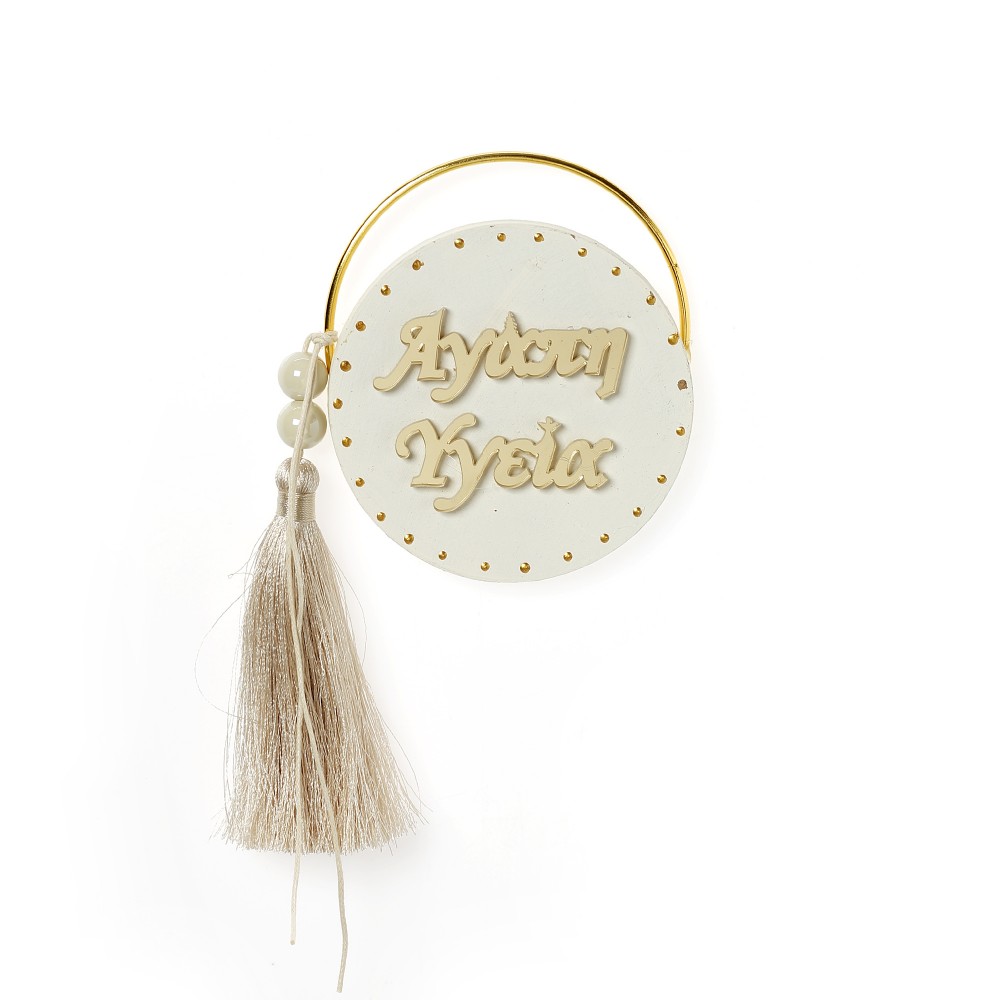Ξύλινο στρογγυλό γούρι κρεμαστό, σε λευκό χρώμα με χρυσό κρίκο και χρυσά plexiglass γράμματα (Αγάπη-Υγεία).