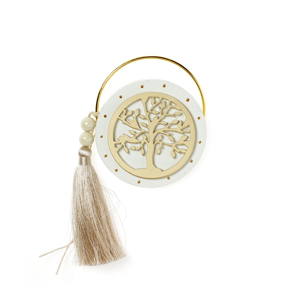 Ξύλινο κρεμαστό γούρι στρογγυλό, σε λευκό χρώμα, με χρυσό plexiglass δέντρο της ζωής και χρυσό κρίκο.