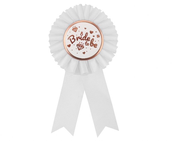 Κονκάρδα παράσημο “”Bride to be”” σε λευκό χρώμα με ροζ-χρυσά γράμματα, για να φορέσει η μέλουσα νύφη και να ξεχωρίζει στο Bachelor πάρτυ!