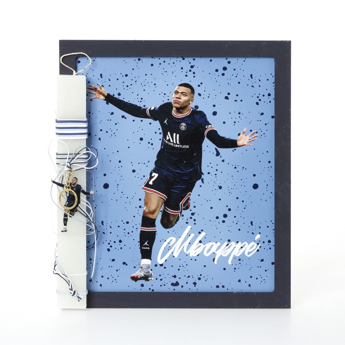 Πασχαλινή λαμπάδα με θέμα Μπαπέ σε εκτυπωμένη ξύλινη κορνίζα.