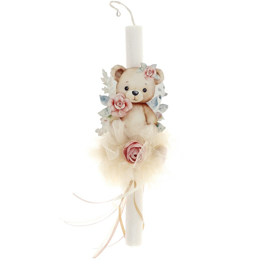 Αρωματική χειροποίητη πασχαλινή λαμπάδα με θέμα αρκουδάκι και λουλούδια.
