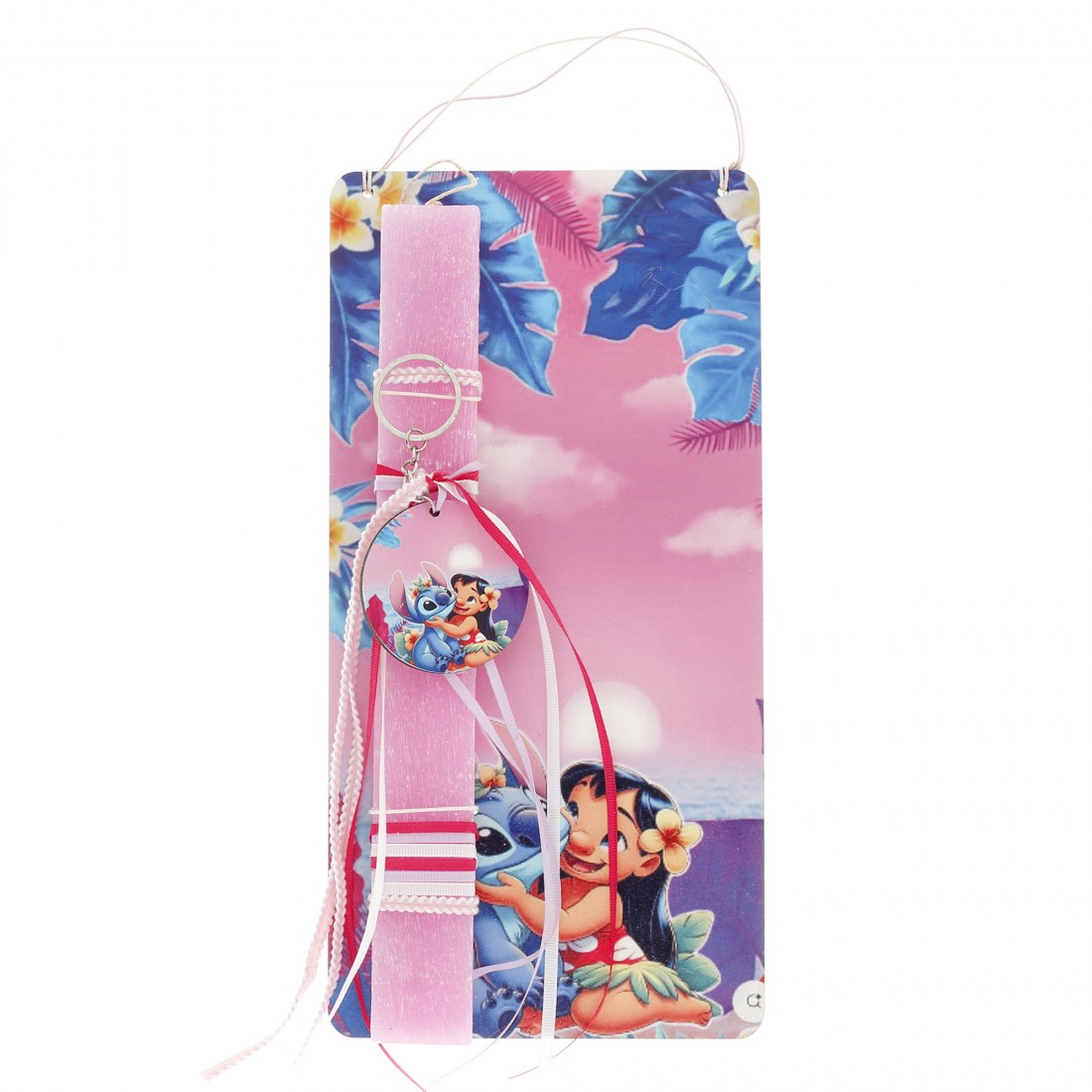 Αρωματική χειροποίητη πασχαλινή λαμπάδα με θέμα stitch σε ξύλινη εκτυπωμένη πλάτη.