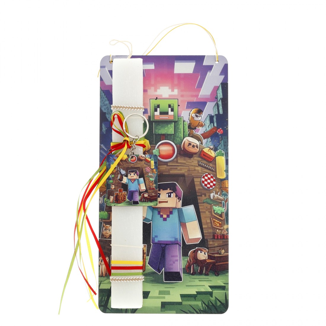 Αρωματική χειροποίητη πασχαλινή λαμπάδα με θέμα Minecraft σε ξύλινη εκτυπωμένη πλάτη.