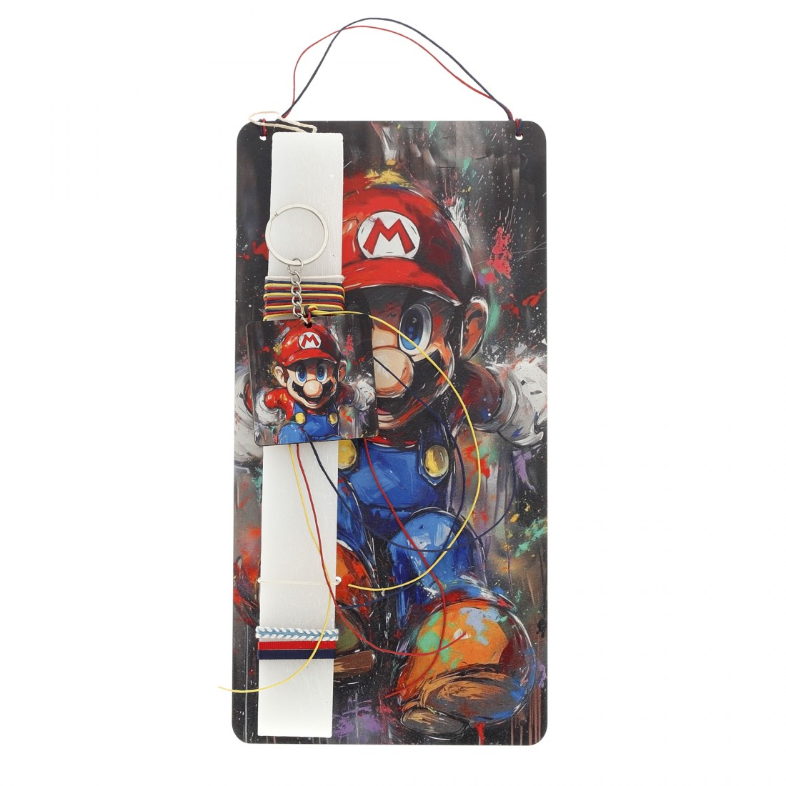 Αρωματική χειροποίητη πασχαλινή λαμπάδα με θέμα super mario σε ξύλινη εκτυπωμένη πλάτη.