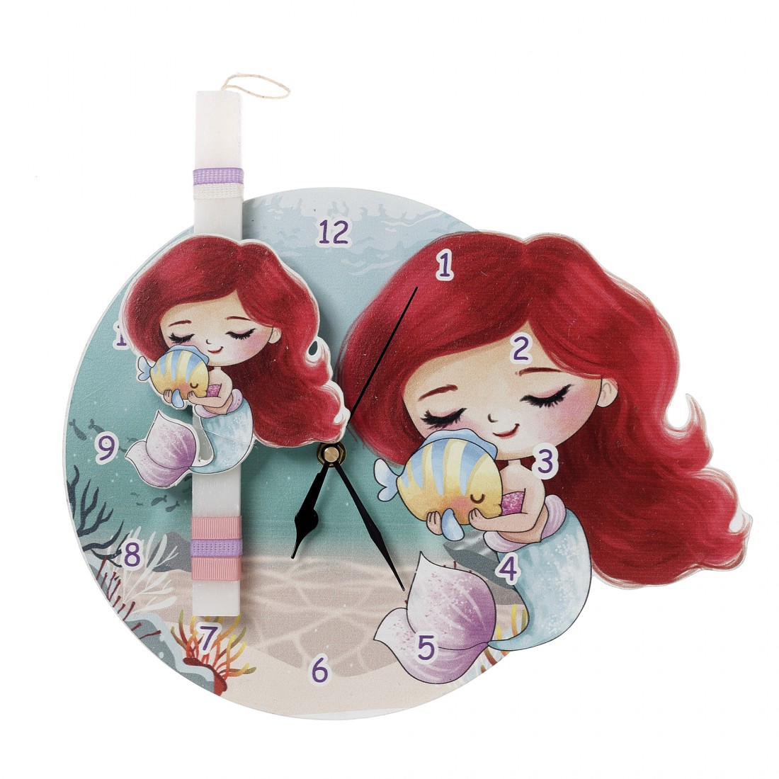 Πασχαλινή λαμπάδα ρολόι με θέμα Ariel σε εκτυπωμένη ξύλινη βάση.