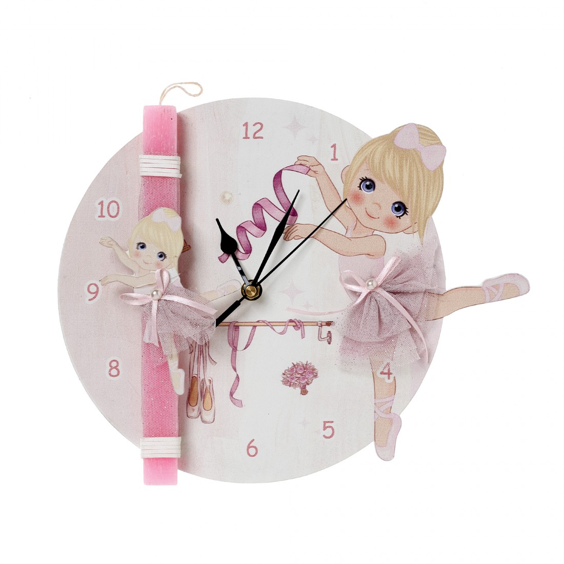 Πασχαλινή λαμπάδα ρολόι με θέμα μπαλαρίνα σε εκτυπωμένη ξύλινη βάση.