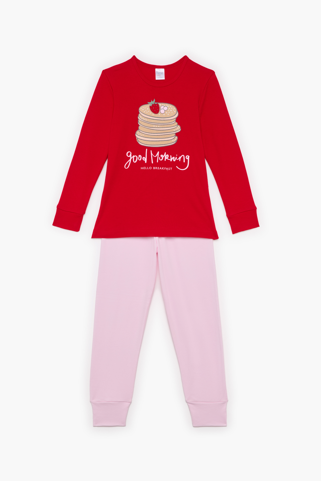 Πιτζάμα Παιδική Χειμερινή με Τύπωμα Good Morning για Κορίτσι Ροζ-Γκρι, Βαμβακερή 100% – Pretty Baby