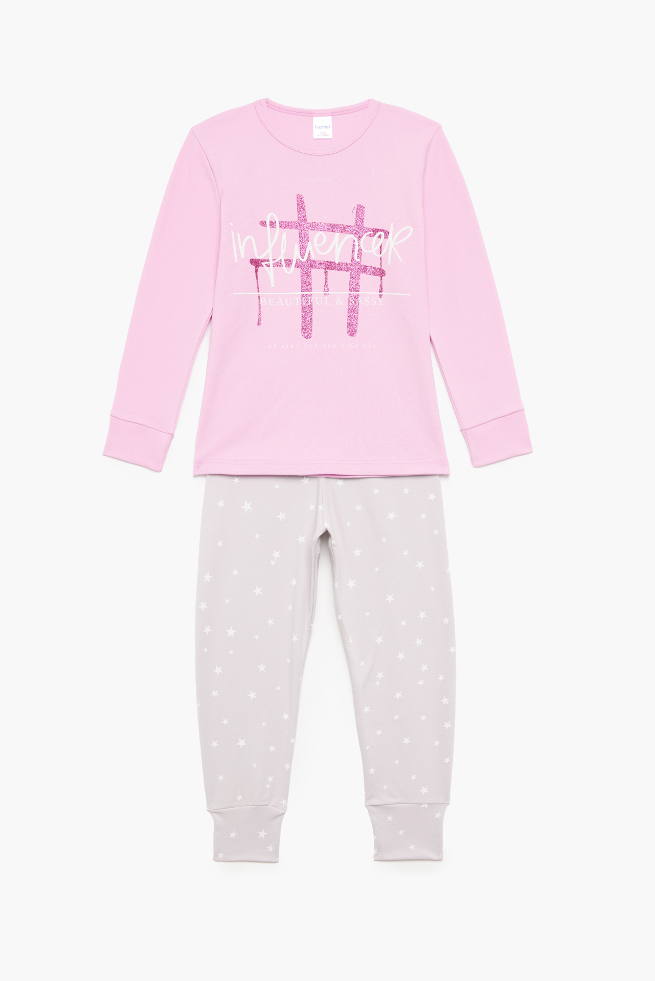 Πιτζάμα Παιδική Χειμερινή με Τύπωμα Star για Κορίτσι Ροζ-Ανθρακί, Βαμβακερή 100% - Pretty Baby