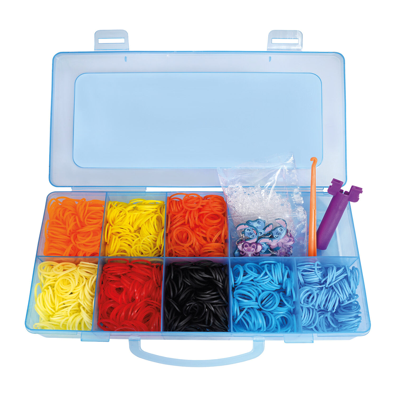 Σετ χειροτεχνίας σε θήκη με 2400 πολύχρωμα λαστιχάκια και 12 αξεσουάρ Stitch για διακόσμηση. Δημιουργήστε μοναδικά και πολύχρωμα βραχιολάκια, δαχτυλίδια και άλλα αξεσουάρ και κάνετέ τα ακόμα πιο εντυπωσιακά προσθέτοντας αξεσουάρ με τον αγαπημένο σας ήρωα Stitch. Ιδανικό για παιδιά που αγαπούν τις χειροτεχνίες και θέλουν να εκφράσουν τη δημιουργικότητά τους. Διατίθεται σε 2 διαφορετικά και trendy χρώματα θήκης, η οποία λειτουργεί σαν αποθηκευτικός χώρος και διευκολύνει το παιδί να πάρει μαζί του όλα τα λαστιχάκια και τα αξεσουάρ του και να φτιάξει οπουδήποτε φανταστικά βραχιολάκια παρέα με τους φίλους του.