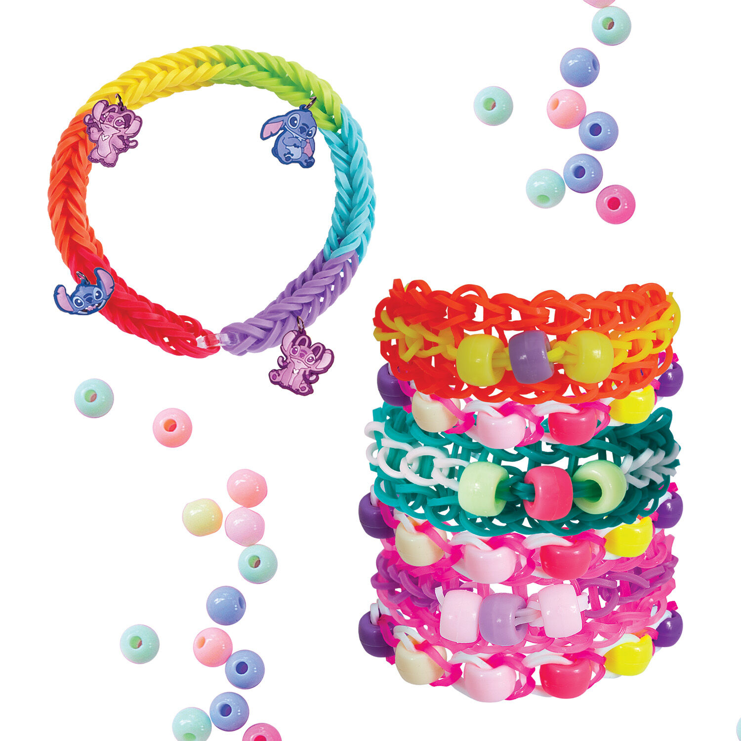 Σετ χειροτεχνίας σε θήκη με 2400 πολύχρωμα λαστιχάκια και 12 αξεσουάρ Stitch για διακόσμηση. Δημιουργήστε μοναδικά και πολύχρωμα βραχιολάκια, δαχτυλίδια και άλλα αξεσουάρ και κάνετέ τα ακόμα πιο εντυπωσιακά προσθέτοντας αξεσουάρ με τον αγαπημένο σας ήρωα Stitch. Ιδανικό για παιδιά που αγαπούν τις χειροτεχνίες και θέλουν να εκφράσουν τη δημιουργικότητά τους. Διατίθεται σε 2 διαφορετικά και trendy χρώματα θήκης, η οποία λειτουργεί σαν αποθηκευτικός χώρος και διευκολύνει το παιδί να πάρει μαζί του όλα τα λαστιχάκια και τα αξεσουάρ του και να φτιάξει οπουδήποτε φανταστικά βραχιολάκια παρέα με τους φίλους του.