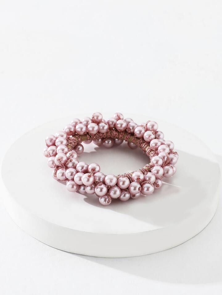Λαστιχάκι μαλλιών διακοσμημένο με πέρλες σε ροζ μεταλλικό χρώμα.