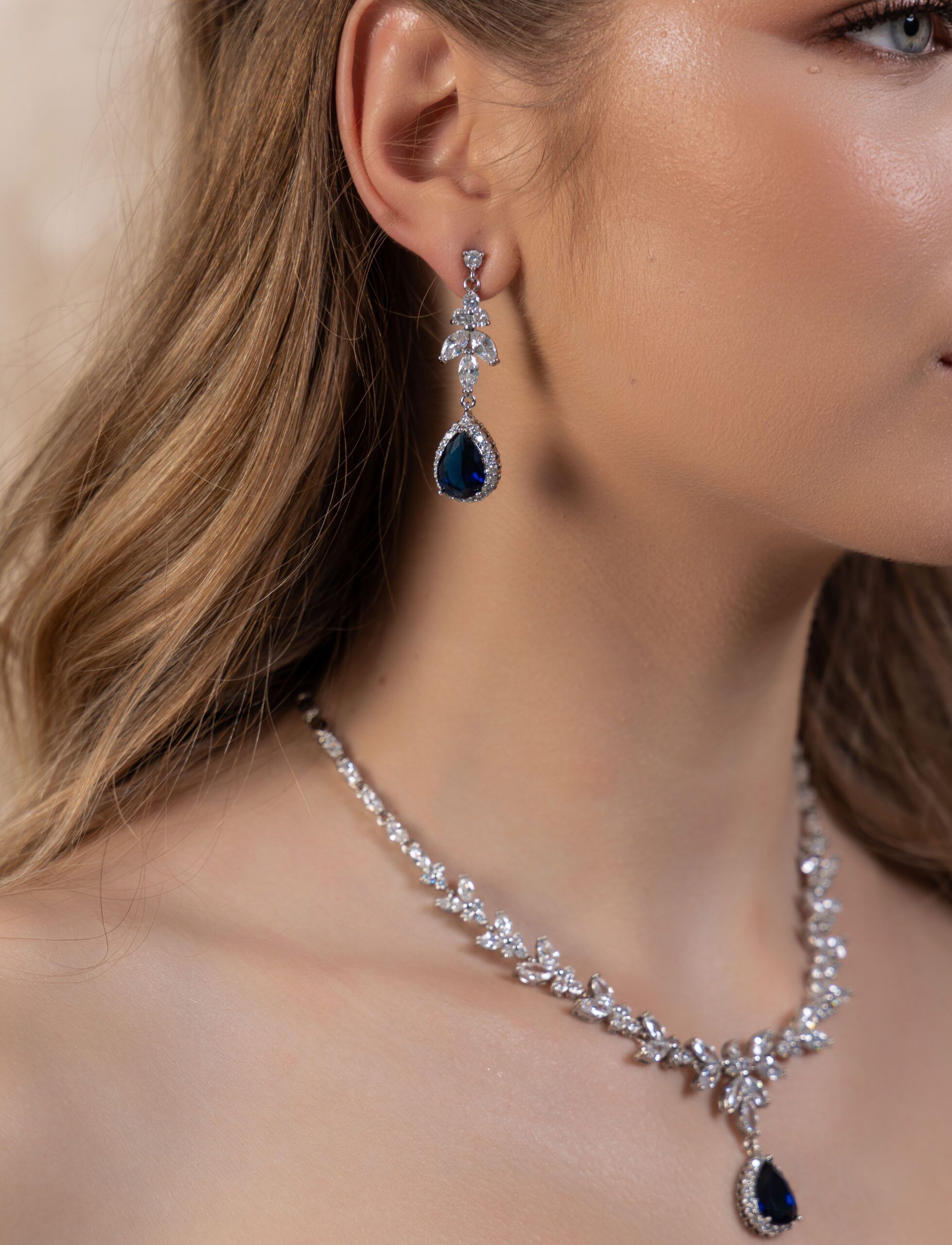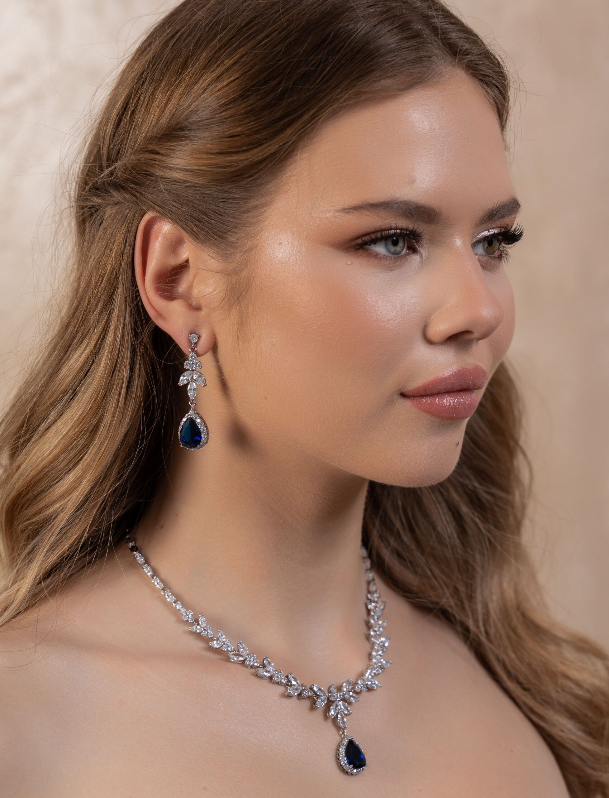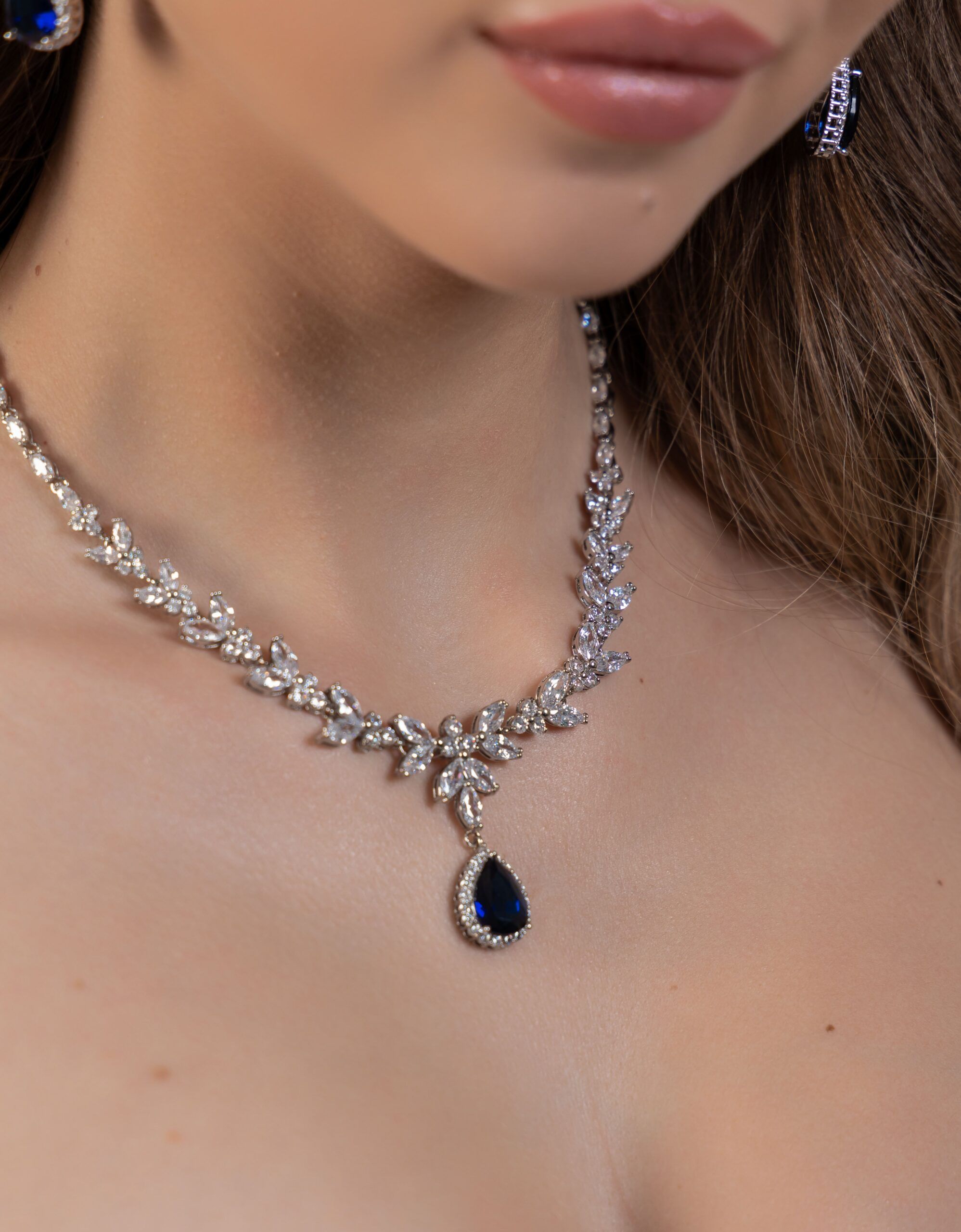 Μοναδικό νυφικό σετ κοσμημάτων που αποτελείται από κολιέ με λευκές και μπλε πέτρες zircon και σκουλαρίκια με λευκά και μπλε zircon για να απογειώσουν οποιοδήποτε νυφικό επιλέξετε για την πιο ευτυχισμένη ήμερα της ζωής σας! Ιδανικά και για επίσημες εκδηλώσεις που χρειάζονται επιπλέον λάμψη!