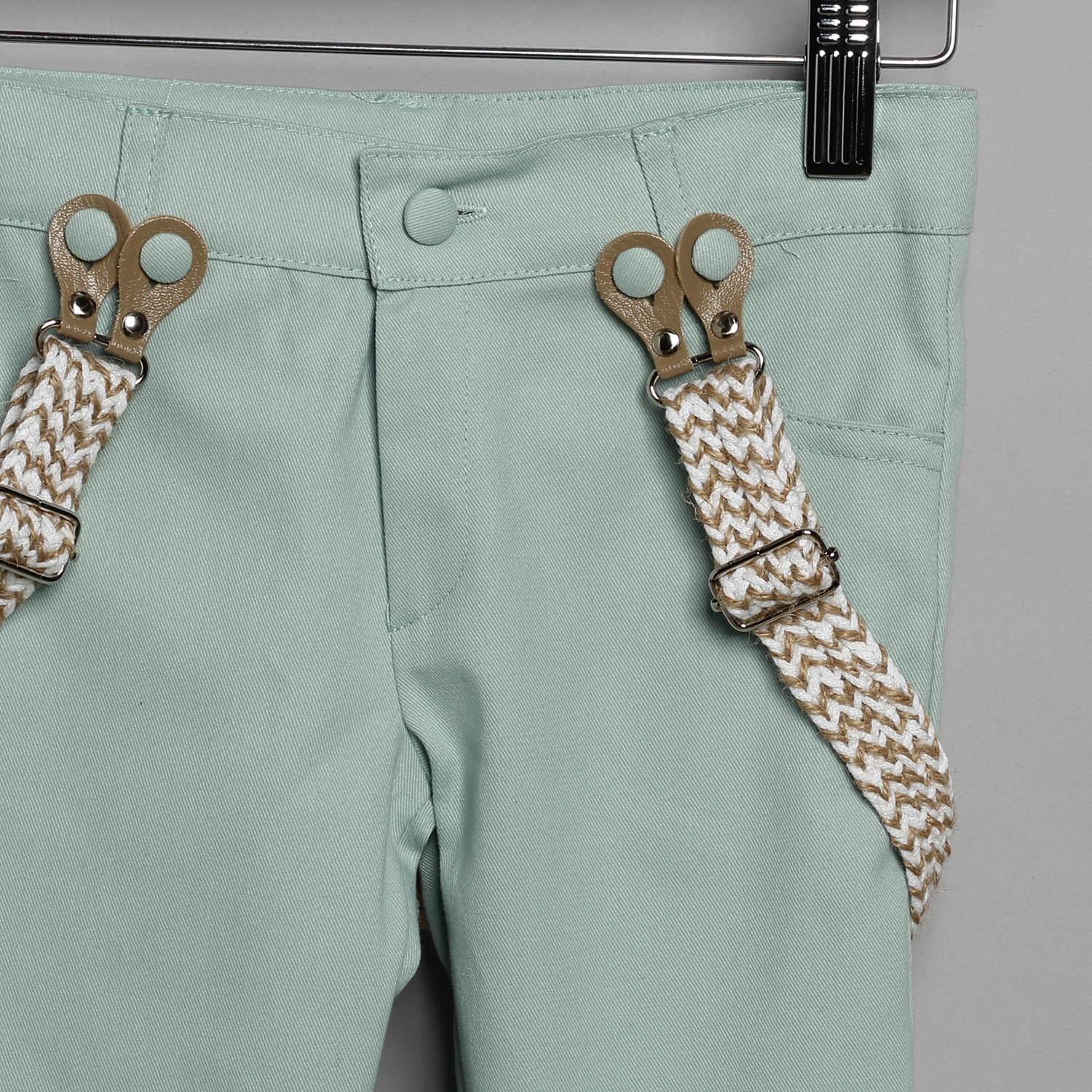 Παντελόνι καμπαρντίνα σε βεραμάν χρώμα. Εσωτερικά υπάρχει λάστιχο με κουμπότρυπα για τη ρύθμιση της μέσης. Διατίθεται επίσης σε άσπρο, εκρού, μπεζ, λαδί, σιέλ και μπλε χρώμα. Συνοδεύεται από σταθερές πλεκτές τιράντες. Πουκάμισο βαμβακερό άσπρο μονόχρωμο. Εσωτερικά του μανικιού υπάρχει θυλάκι, για να στερεώνεται το μανίκι όταν είναι σηκωμένο. Διατίθεται σε πολλά χρώματα. Γιλέκο με δυο διαφορετικές πλευρές. Η δεξιά είναι καμπαρντίνα σε βεραμάν χρώμα και η αριστερή είναι καμπαρντίνα από εκρού-μπεζ ψαροκόκκαλο. Στο γιλέκο υπάρχουν δυο κρυφά τσεπάκια στα πλαϊνά και ένα στο πέτο. Το σύνολο συνοδεύεται από ξύλινο παπιγιόν και ψάθινο άσπρο καβουράκι με κορδόνι πλεξούδα.