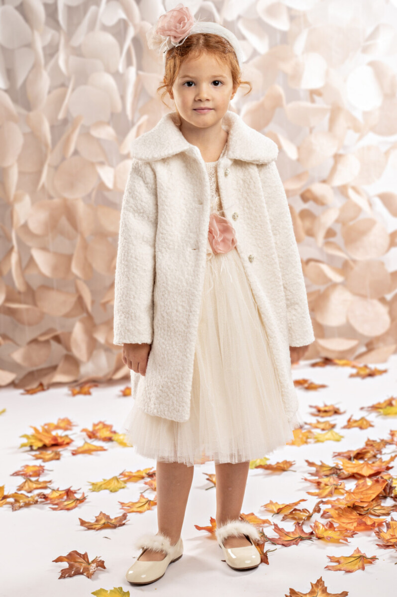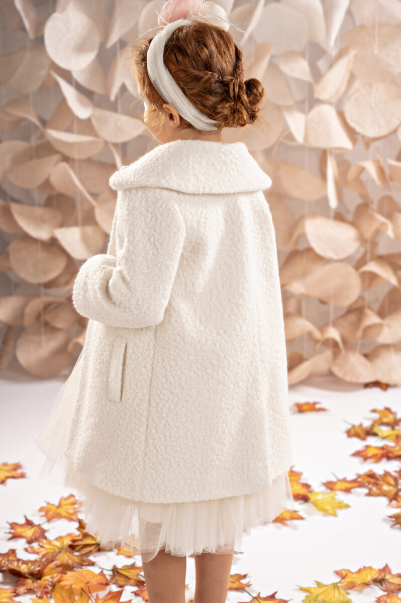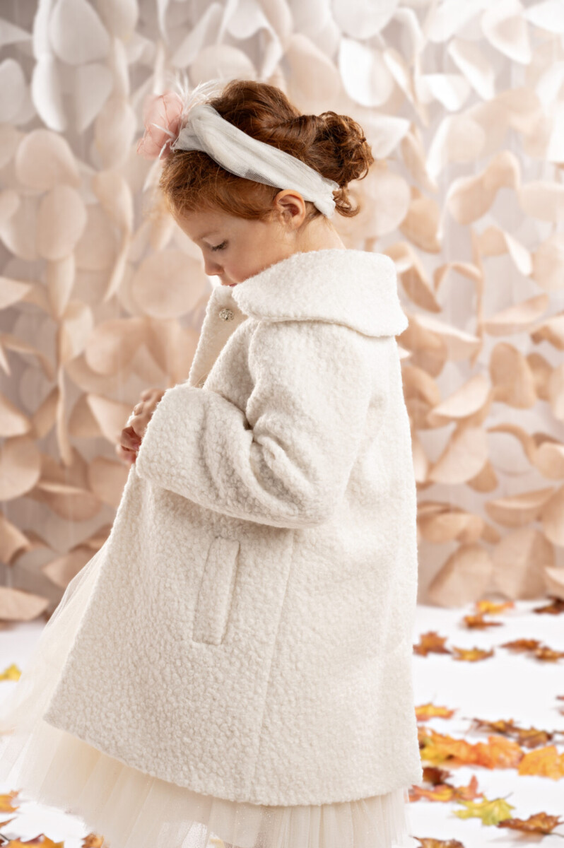 Ένα σικάτο παλτό σε γραμμή Α, από μπουκλέ μάλλινο ύφασμα σε απόχρωση of white, με μεγάλο στρογγυλό γιακά, στρασένια ρετρό κουμπιά που προσθέτουν μια δόση glamour και φέρνουν στο νου όμορφες χειμωνιάτικες αναμνήσεις.