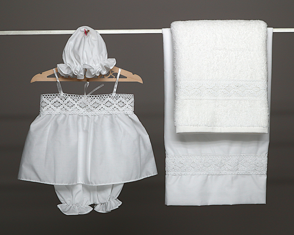 Βαπτιστικό σετ λαδόπανων για κορίτσι σε λευκό, με δαντέλα βαμβακερή, ατραντέ
